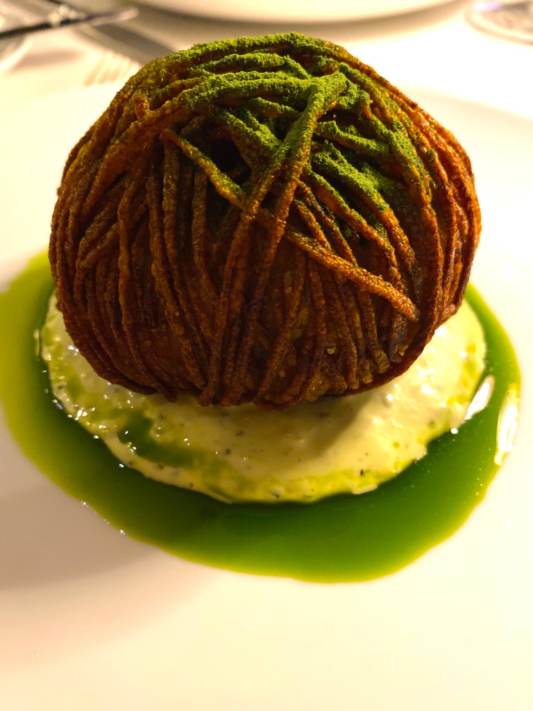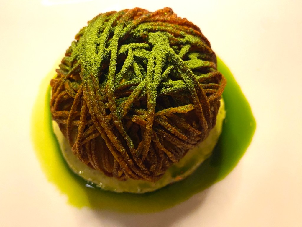 Now here are some of the classics, beginning with a gorgeously unique crab cake – I shared this on social media yesterday as a tease and everyone guessed it was green Matcha tea over a dessert: