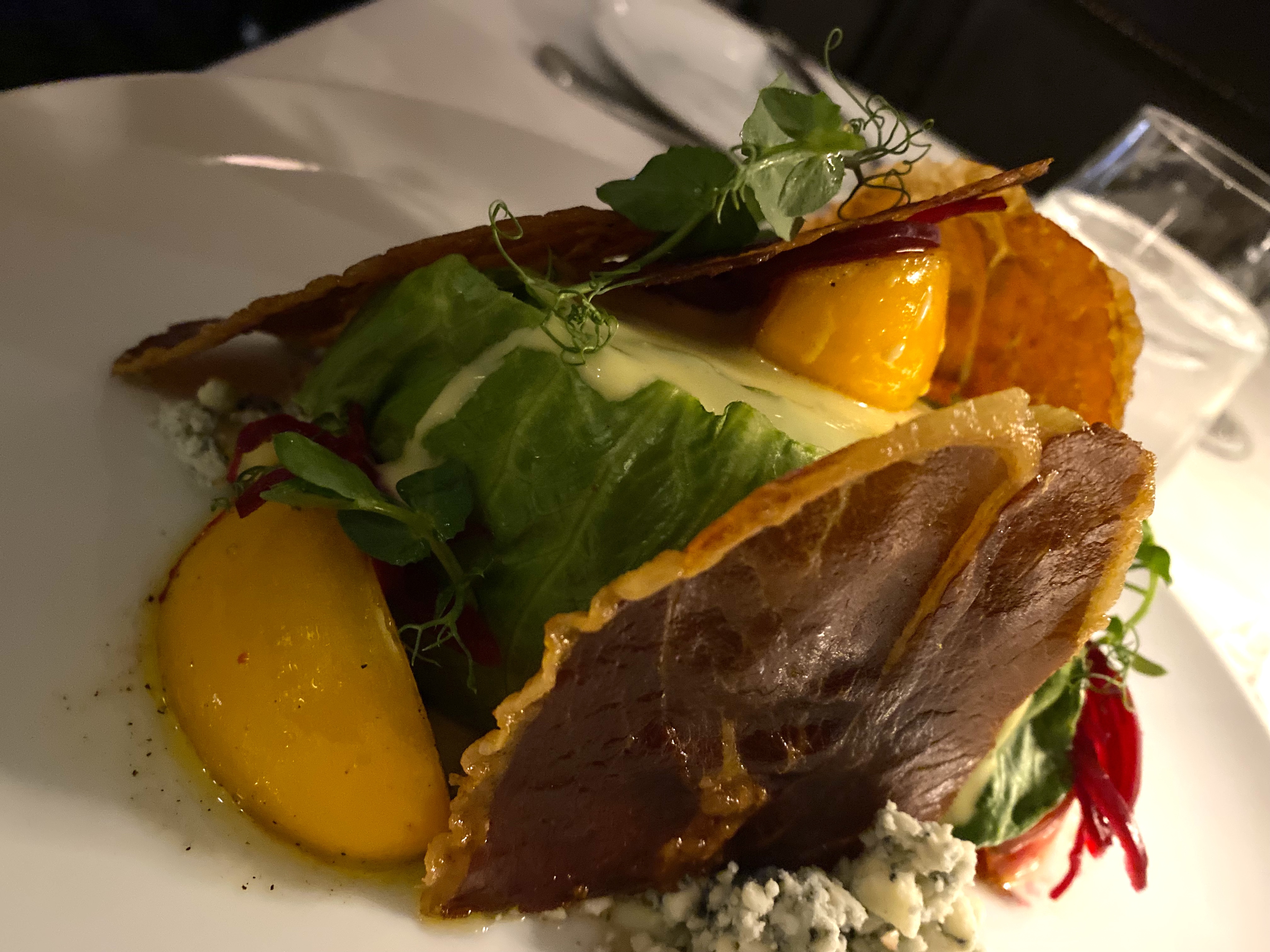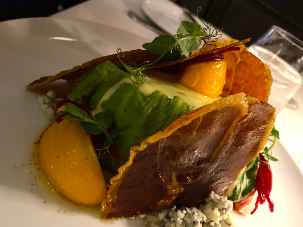 This salad as Iceberg, lettuce with Heirloom Tomato, Red Onion, Kikorangi Blue Cheese, and Yuzu Honey Vinaigrette – all held together by Prosciutto Chips!