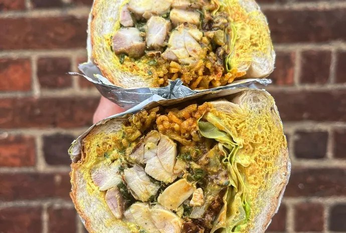 Edd Watkinson who runs the Big Deal’s Bodega in Norwich, which sells giant sarnies featuring everything from peaches to samosas, says the key to the gargantuan trend is “providing customers with a sandwich that’s so far removed from a sandwich they’d make themself at home”.