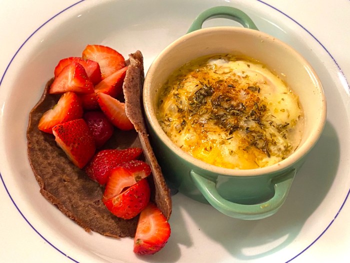This is a great breakfast: baked eggs and a chocolate taco with fresh strawberries. It’s all because my great friend and Chef / Author Barbara included it in her cookbook titled “Chocolate For Breakfast” and cheers to that!