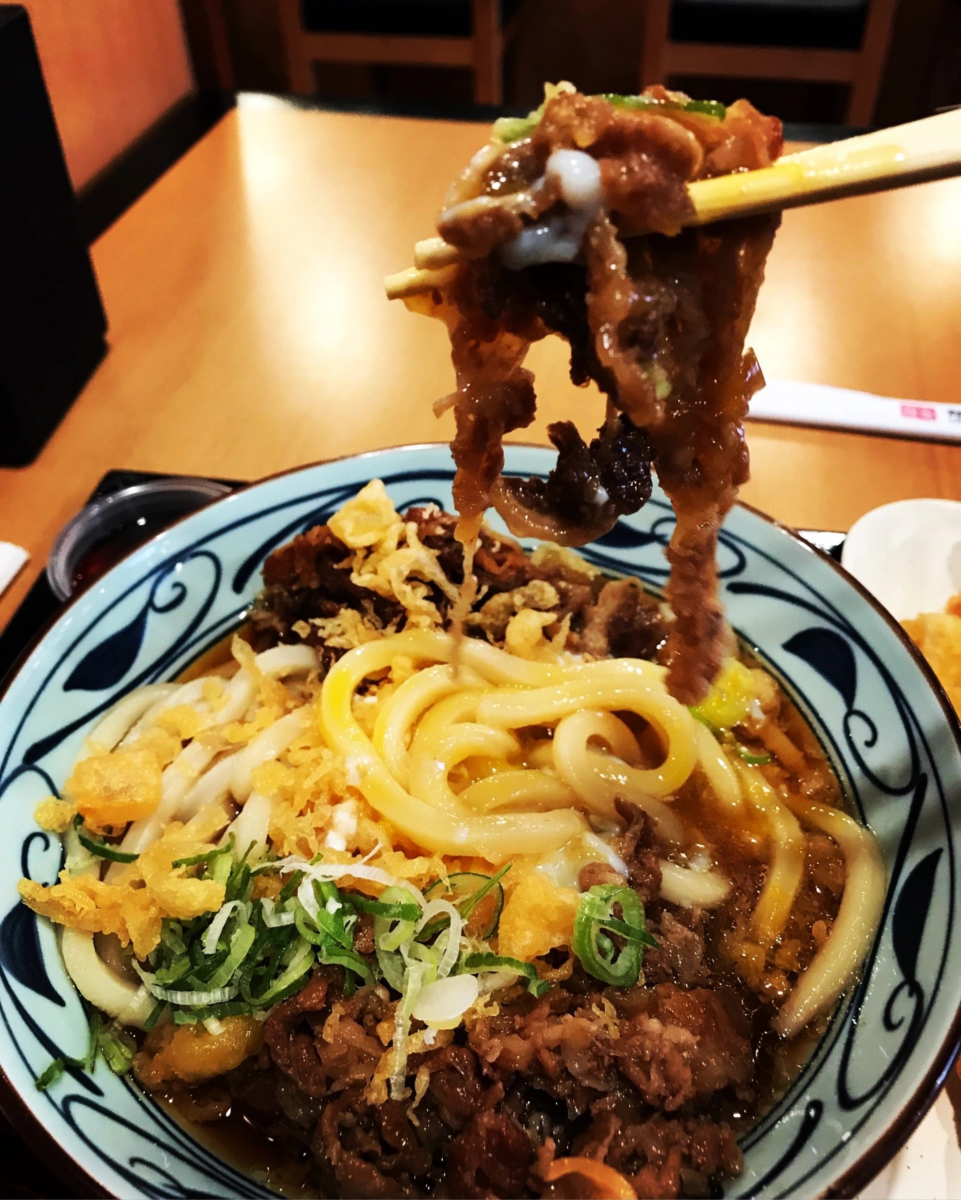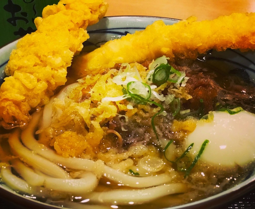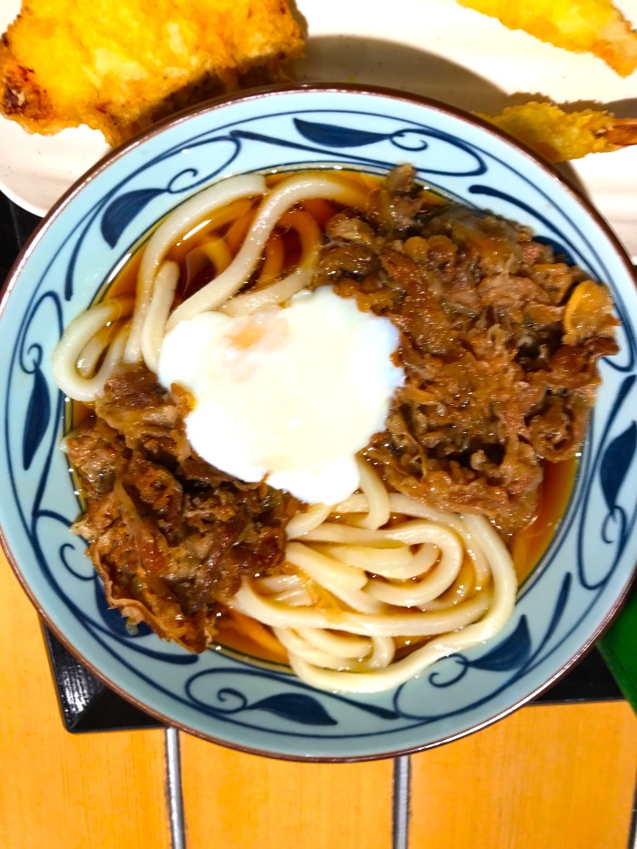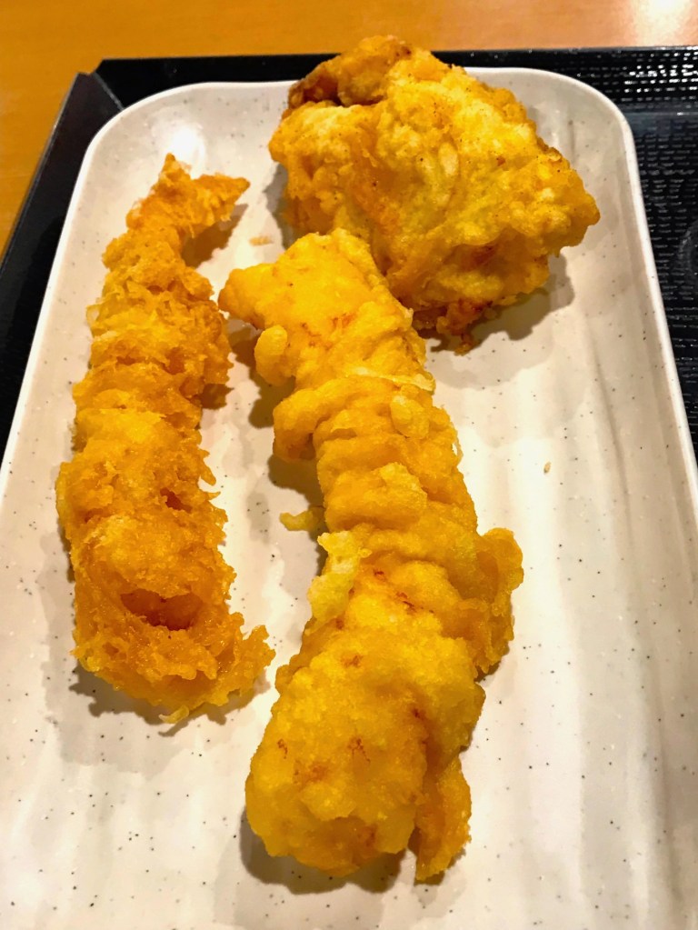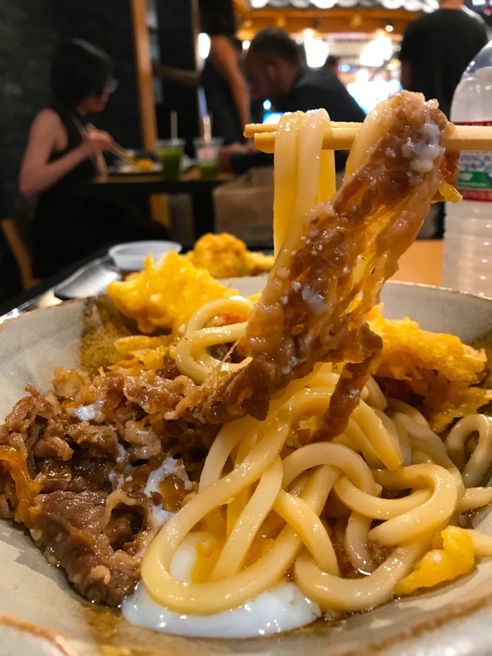 So what did I have? I got the udon with sweet beef and a soft-boiled egg added, then got myself some chicken, shrimp and squid tempura – and it was time to dig in…