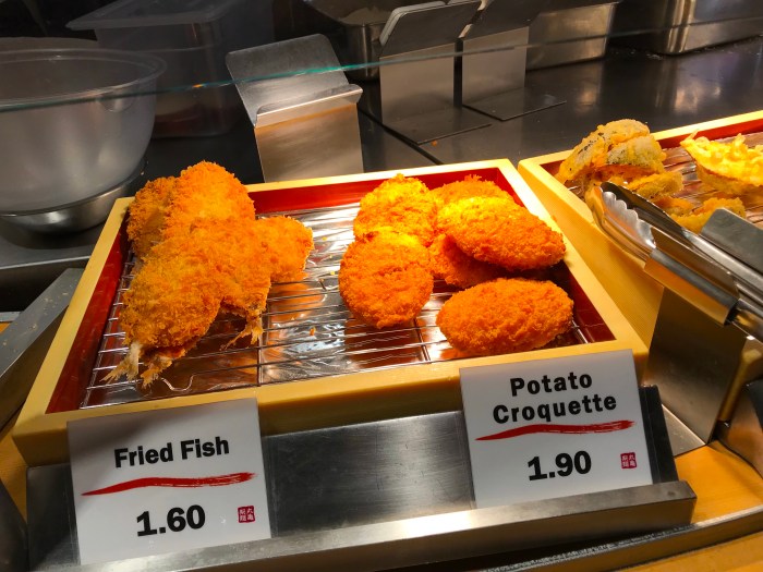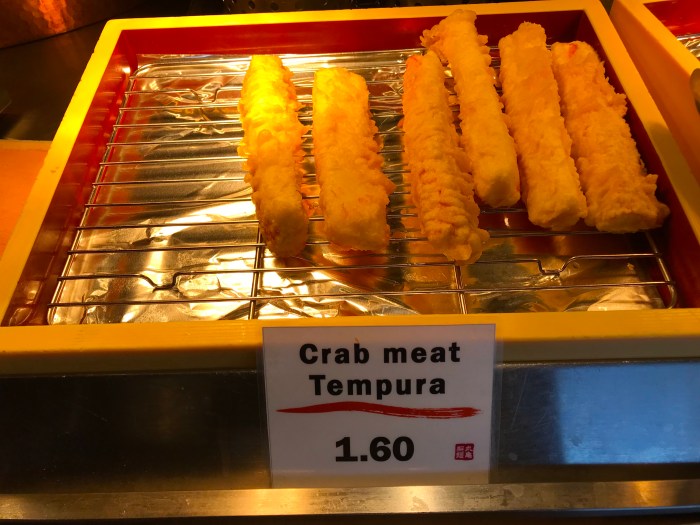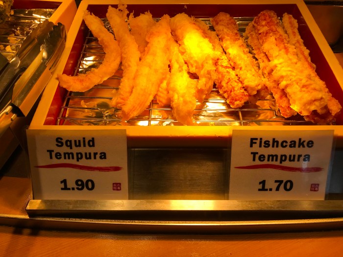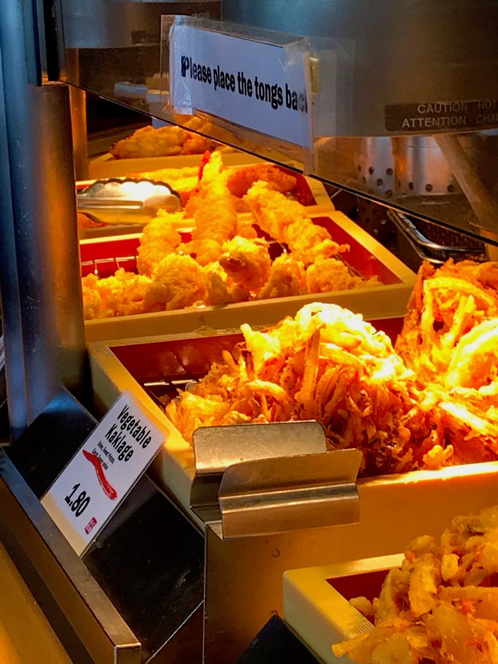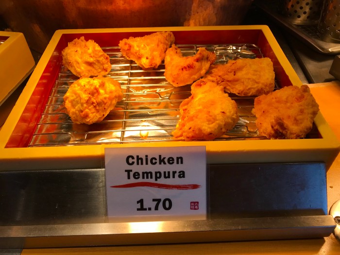 Then you slide your tray, cafeteria-style, past a terrific array of tempura: everything from chicken (Karaage!) to vegetables, asparagus, squid, fishcake and more…here’s how I did it: