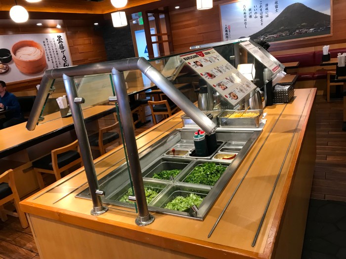 After sliding around to the cashier, you can head over to the condiment bar, where there are fresh herbs, green onions and tempura krispies as well…