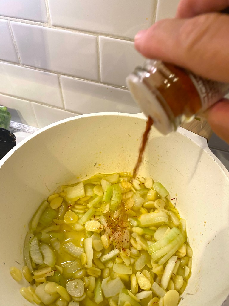 I heated the oil over medium heat and added the onions first, letting them caramelize just a bit then added the garlic…after about ten minutes I added the Paprika and Saffron – which I used instead of Turmeric as my local store was out!