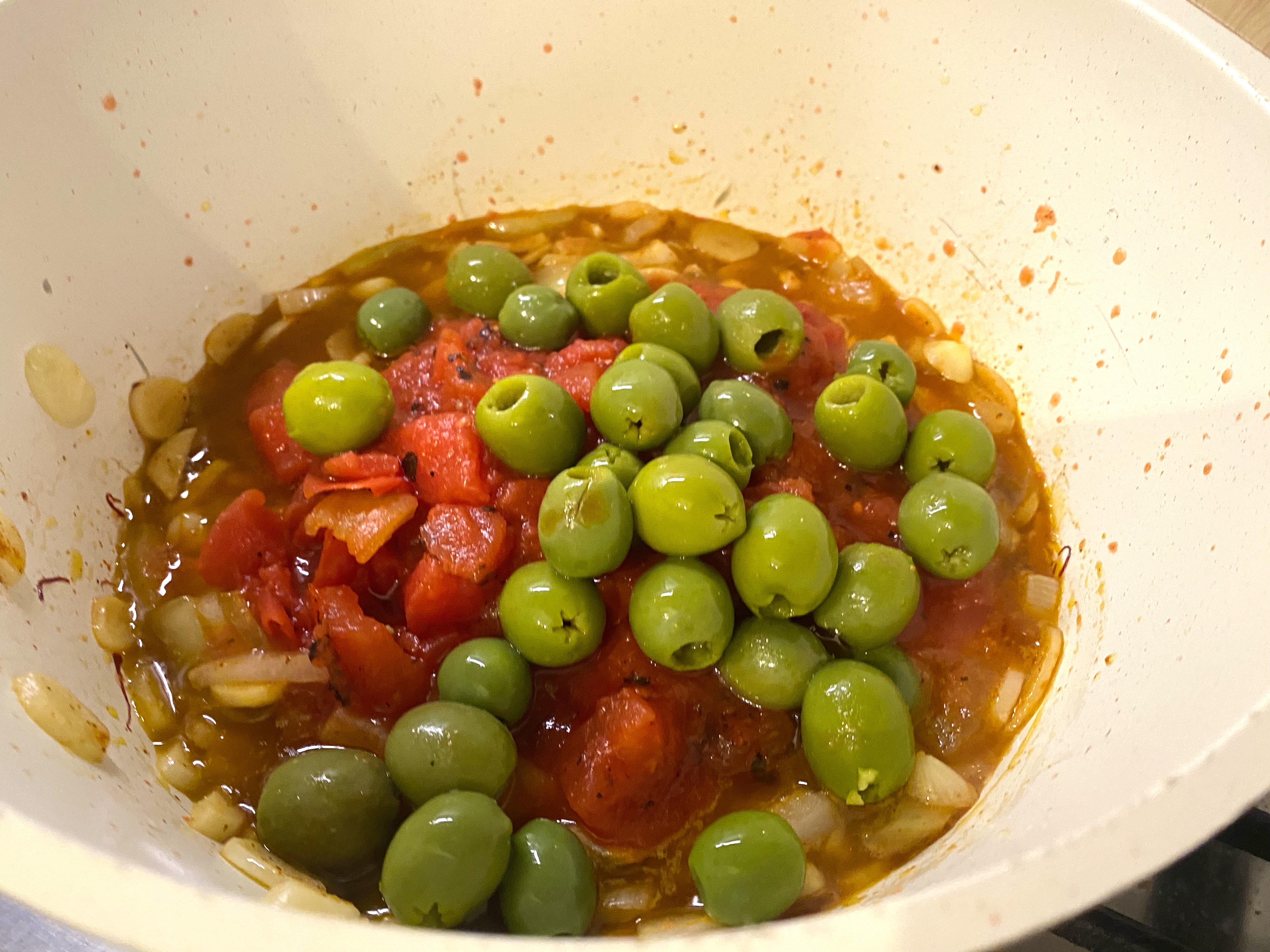 I loved these green olives, very briny and full of flavor. I added them to the dish and let them warm for a minute in the sauce: