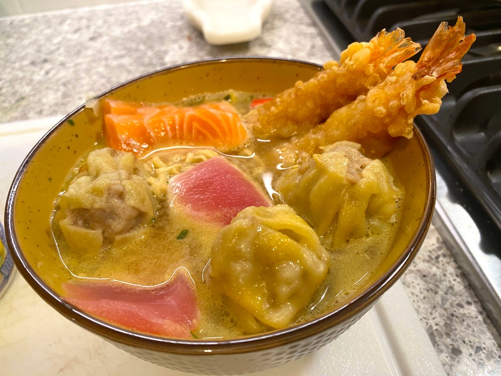 I bought some sashimi tuna and salmon, two shrimp tempura, as well as some frozen pork and crab Shu Mai….I explain my plan in this video: