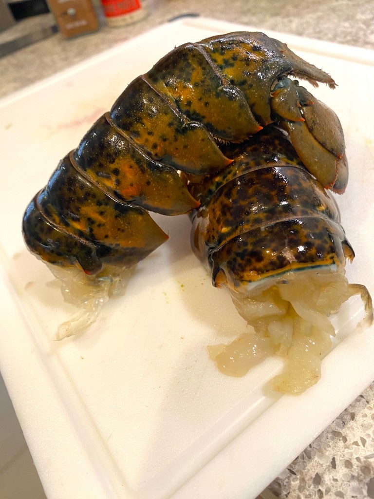 I bought two fairly small Lobster tails, and the first step is to separate them from their shell…pretty easy, I cut the bottom with scissors and literally cracked them lengthwise…here’s how easy it was: