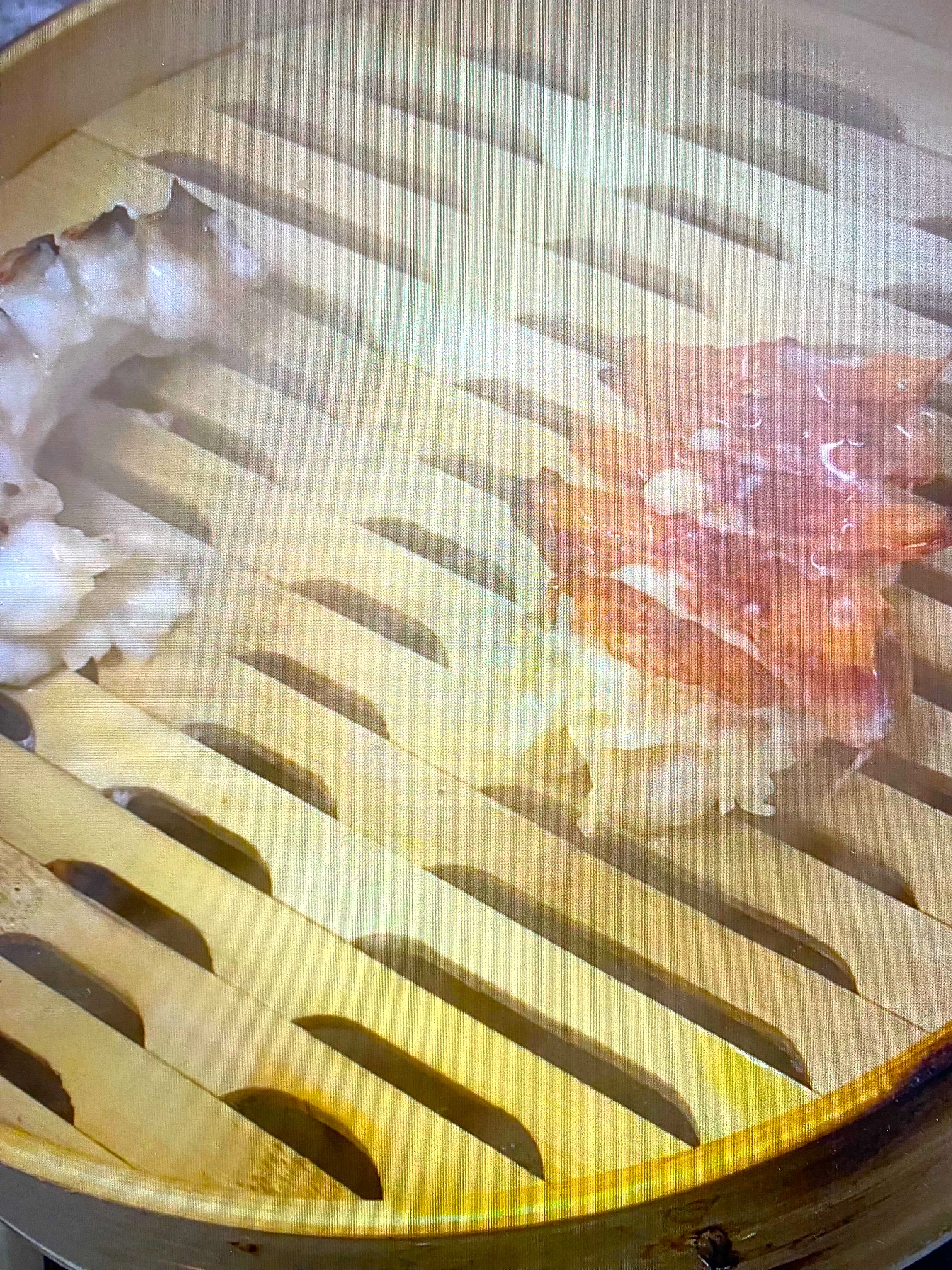 I placed the lobster in the top half of a steamer over boiling water, covered and steamed for 4 minutes. Immediately immerse the cooked tails in an ice water bath to stop the cooking.
