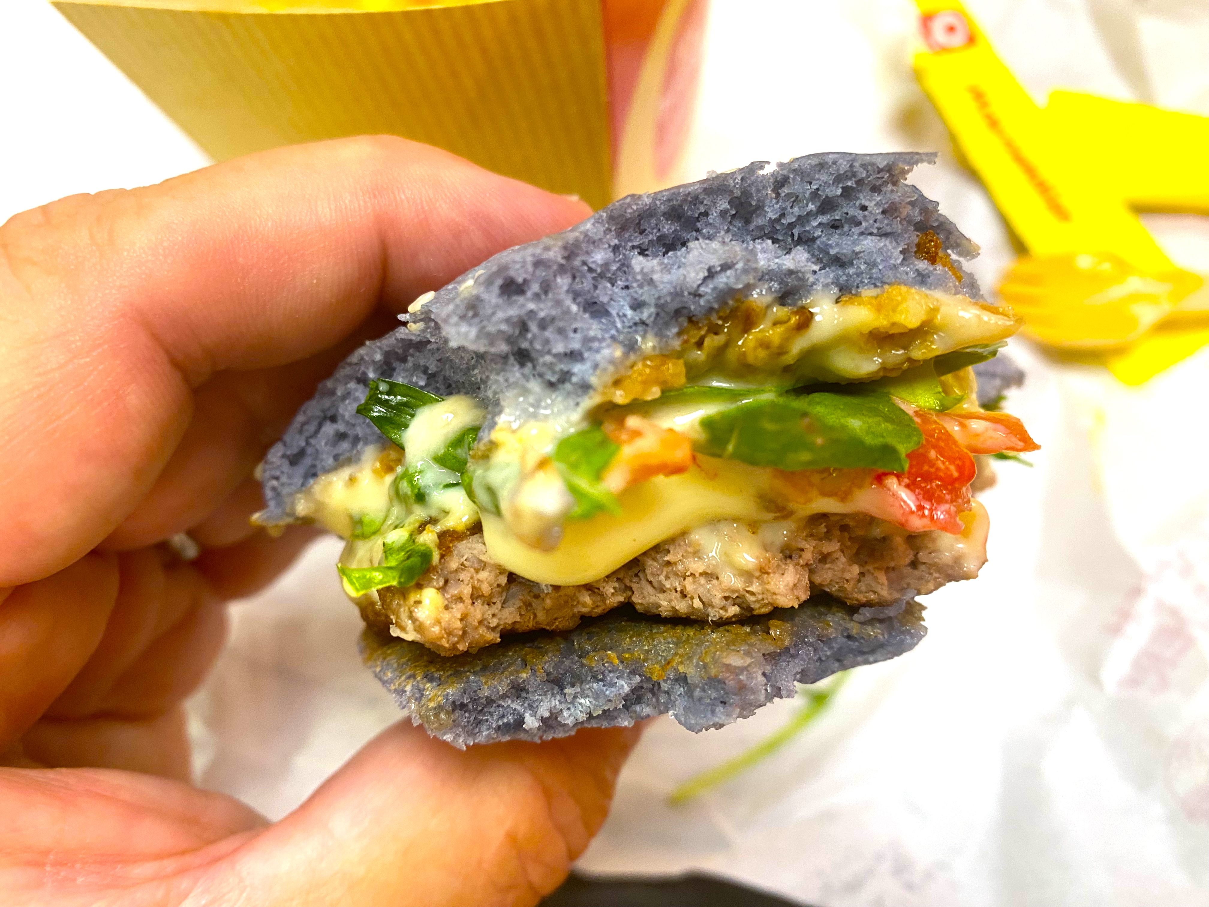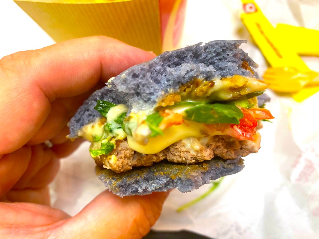 The title of this post was “captivating ad vs. culinary reality” and this is why: this has a fleeting resemblance to the burger promoted in the ad. First of all, the “bright blue” bun was a bit dreary and closing in on grey: