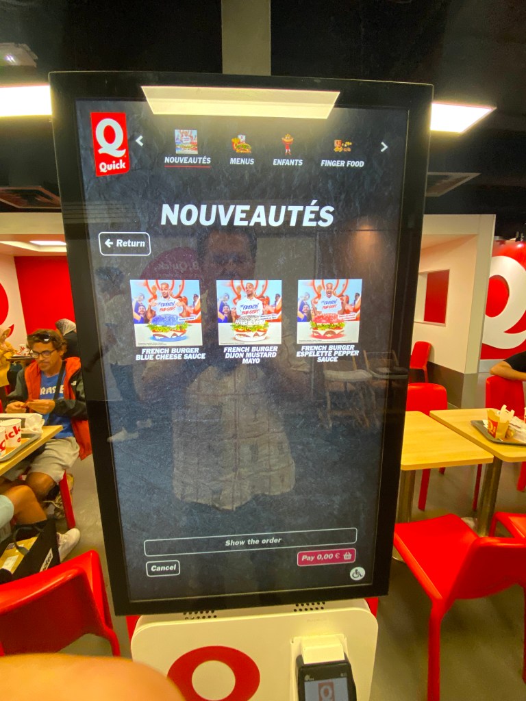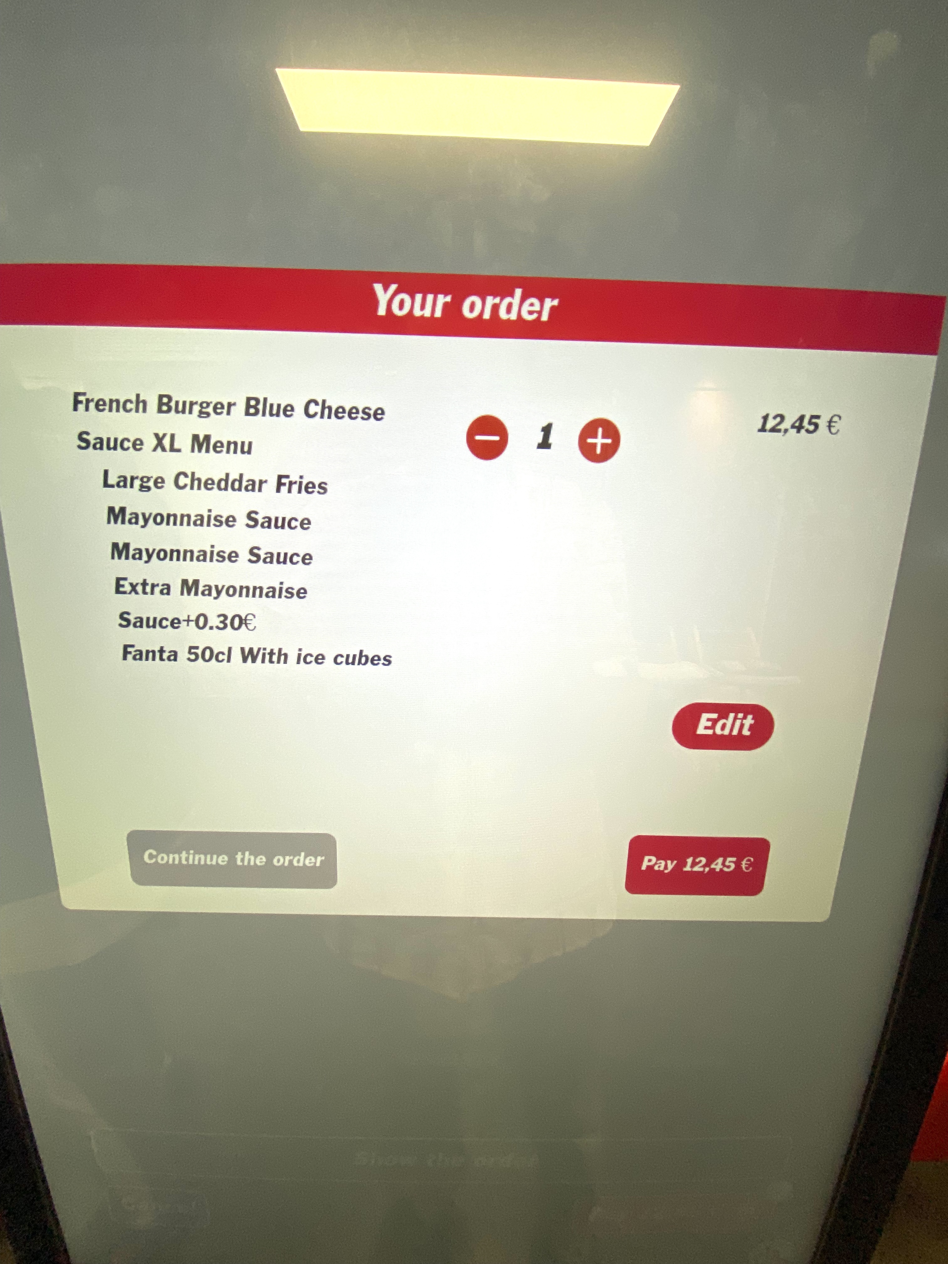 I chose the bleu cheese burger with large cheddar fires and extra mayonnaise…as you can see the prices was just over 12 euros, so about $13 – and by the way, this is the last time I was able to film inside as I was told by a security guard that it wasn’t allowed!