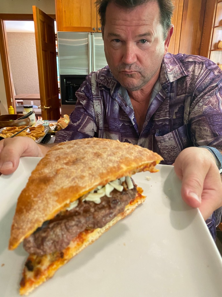 Yes, I decided to take those two leftover slices of pizza and use them as the bun for a pizza-shaped cheeseburger! And of course, I also decided to use the hot grill wisely, and added some hot dogs and sliders to my feast as well!