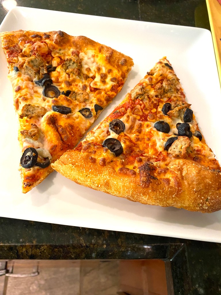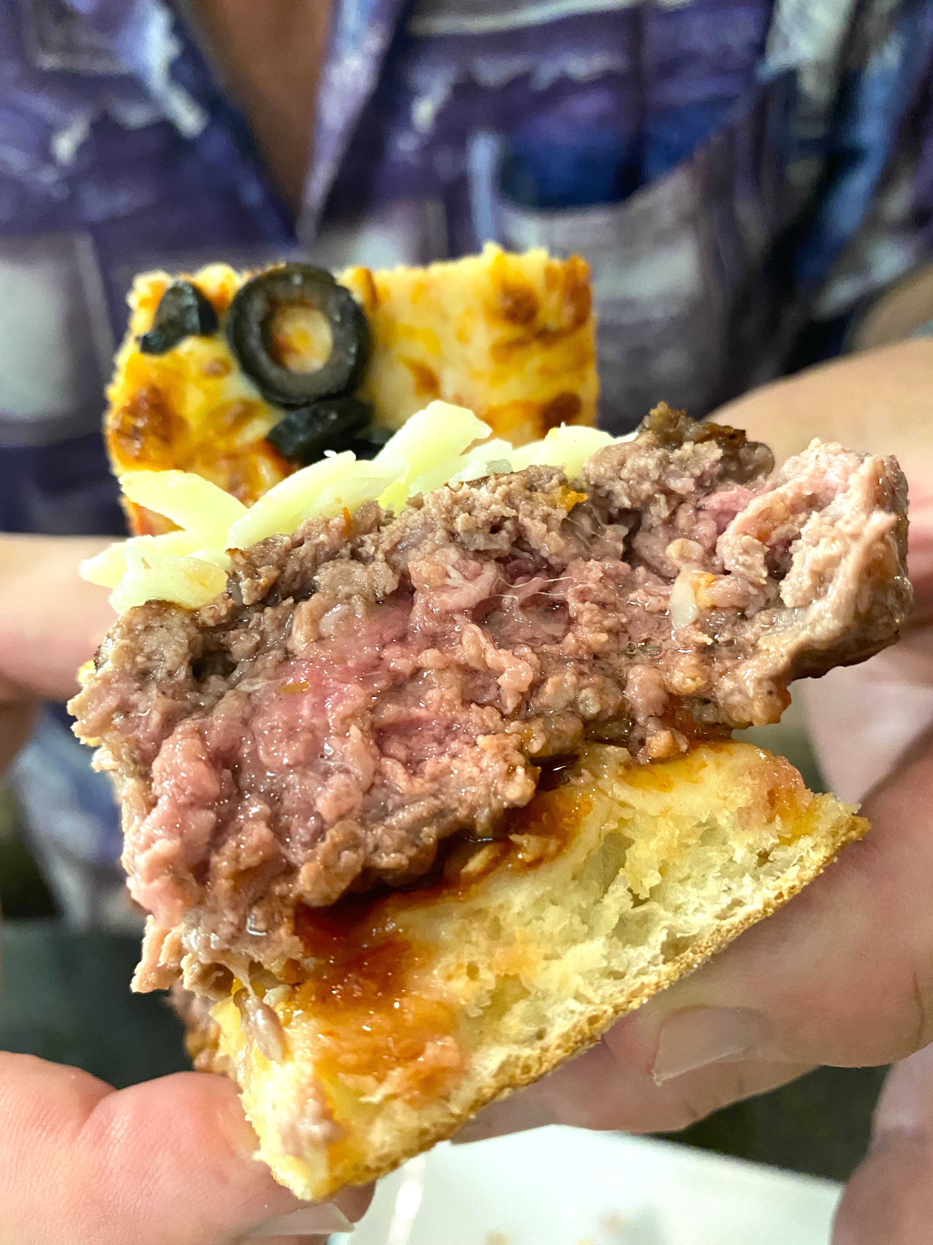 And here you are: a cheeseburger with a “pizza slice bun” – no need to add condiments because the pizza had black olives and tomato already embedded in it!