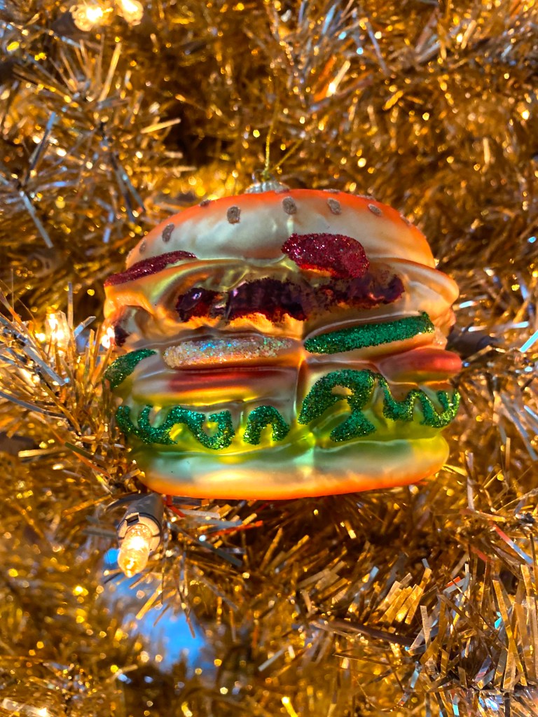 My good friend Steph knew my obsession and got me this great gift – a fully loaded cheeseburger ornament!