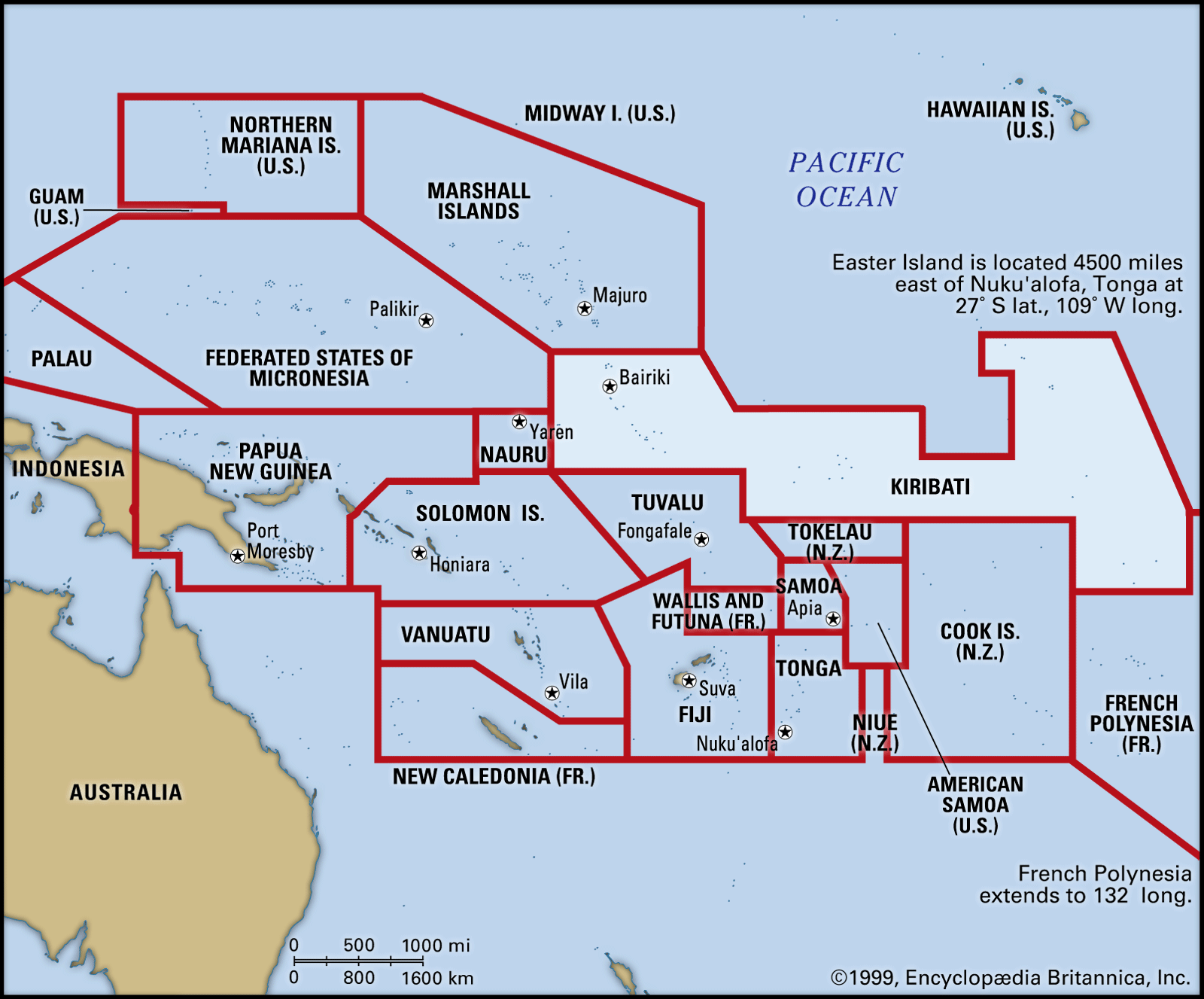 This map shows you how sprawling the South Pacific is…Kiribati was a British colony that gained independence in 1979…Kiribati is pronounced “Kiri-bas” and is made up of 33 atolls in the equatorial Pacific. The islands are low-lying and at risk from rising sea levels due to climate change.
