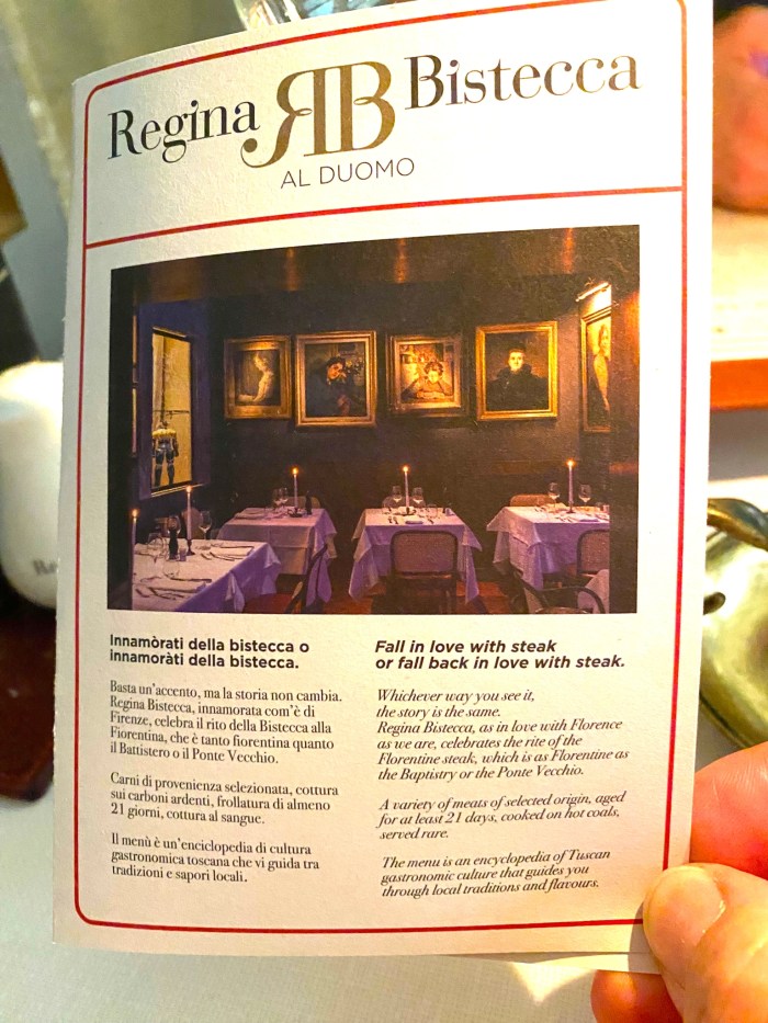 According to the internet, bistecca (steak) alla fiorentina is an Italian dish of steak cut from the sirloin of a young Chianina cow. The name comes from the Latin word flōrentīna, which means “of Florence.”