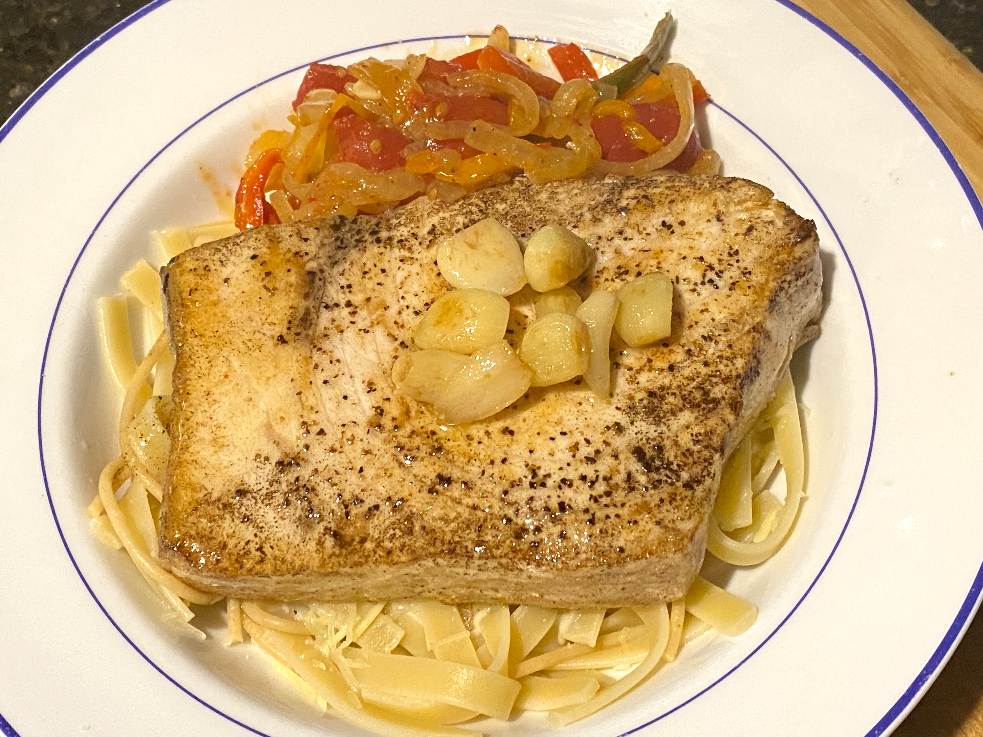 You finish the dish by adding the Piperade to the top of the fish or serve it on the side…I served my fish on top of fettucine, as the garlic sauce worked well on it!