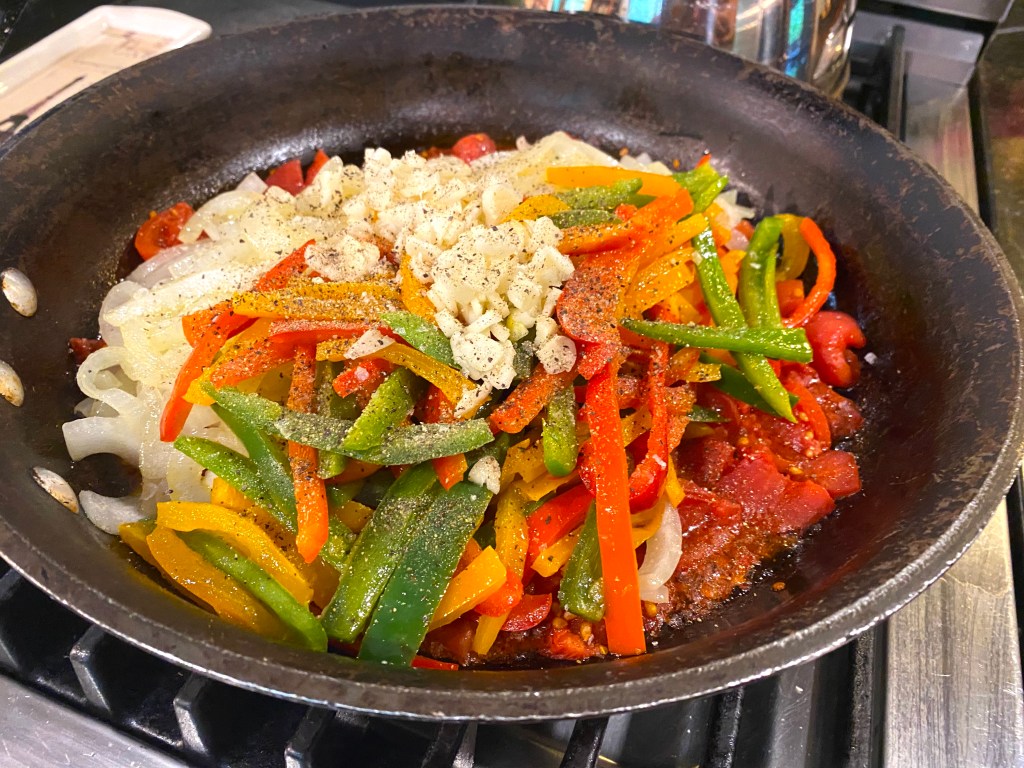 Add the onions and peppers to the tomato mix…stir in the raw minced garlic and season with salt and pepper…cook uncovered over low heat for one hour, stirring occasionally…it looks beautiful when done…