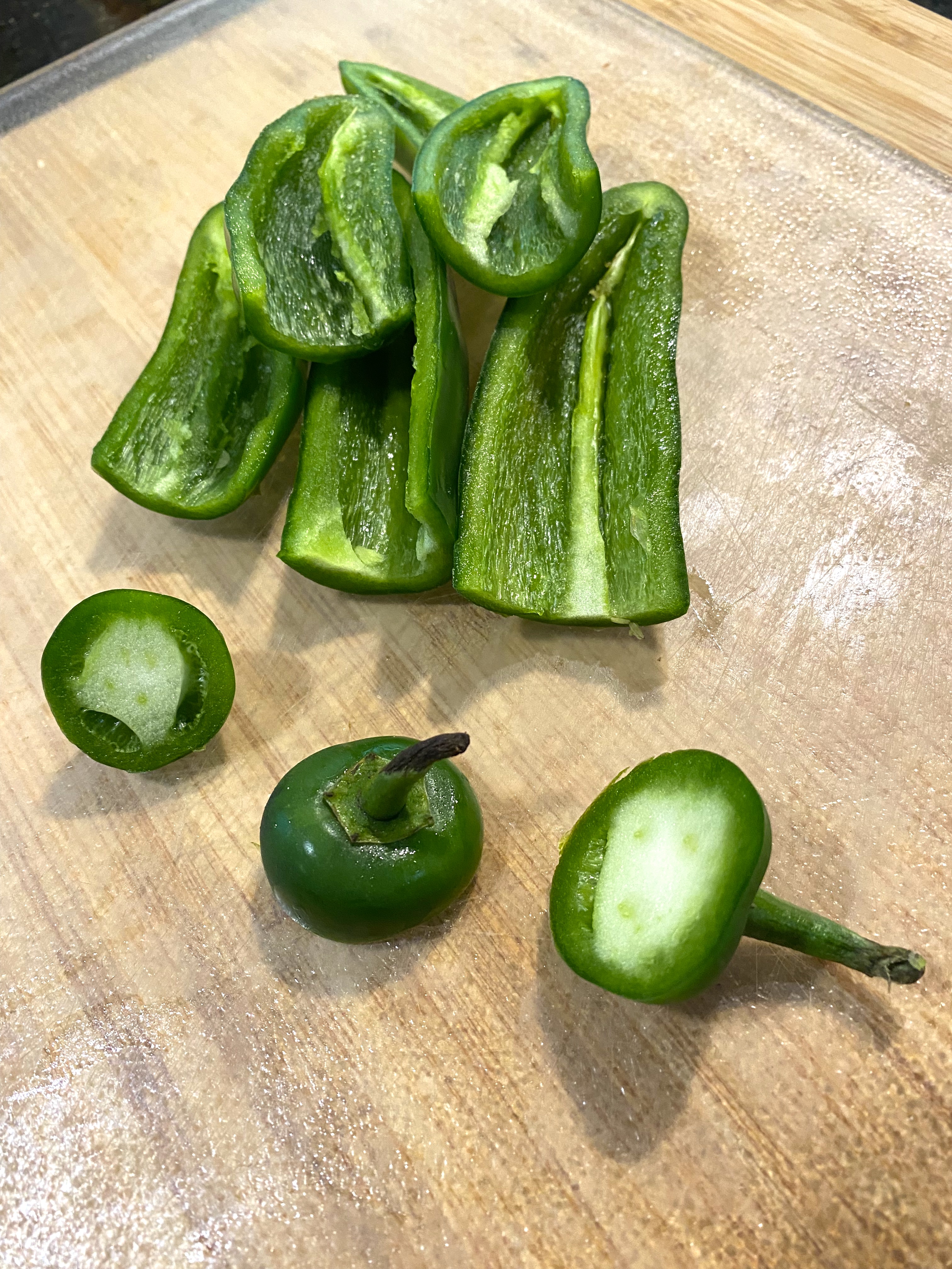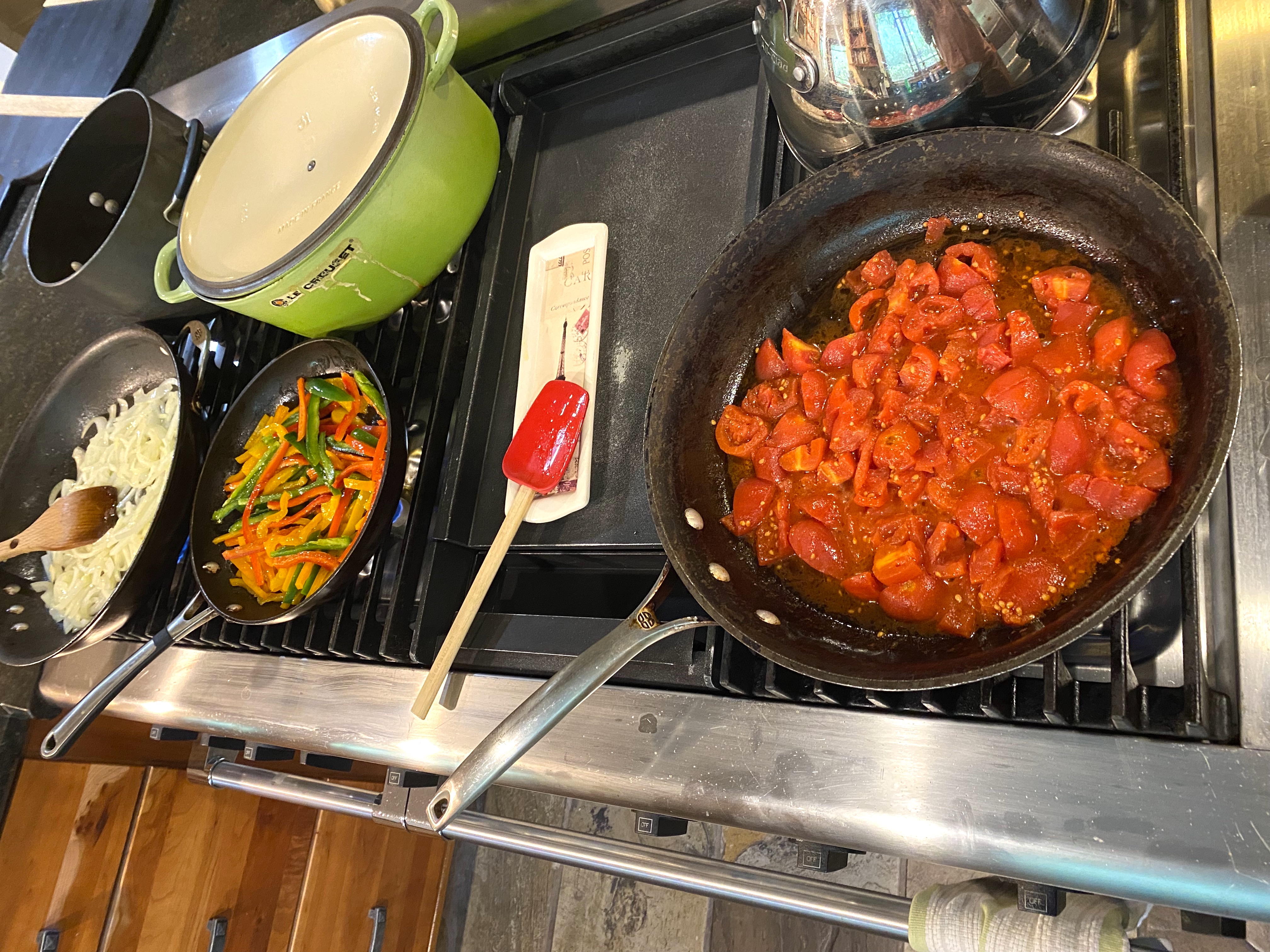 In another medium skillet, heat 2 tbl. of the oil and cook the chiles and bell peppers until soft and tender, about 10 minutes…yes, I had three pans going at once – take a look!