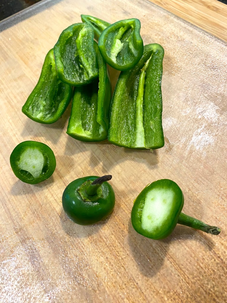 Cut the tops of the chiles, slice in half lengthwise and remove all seeds – then cut chiles into very thin strips