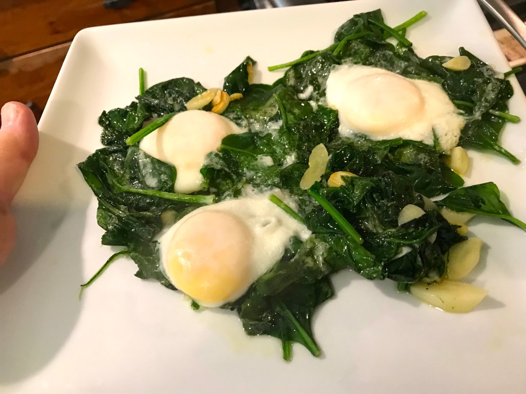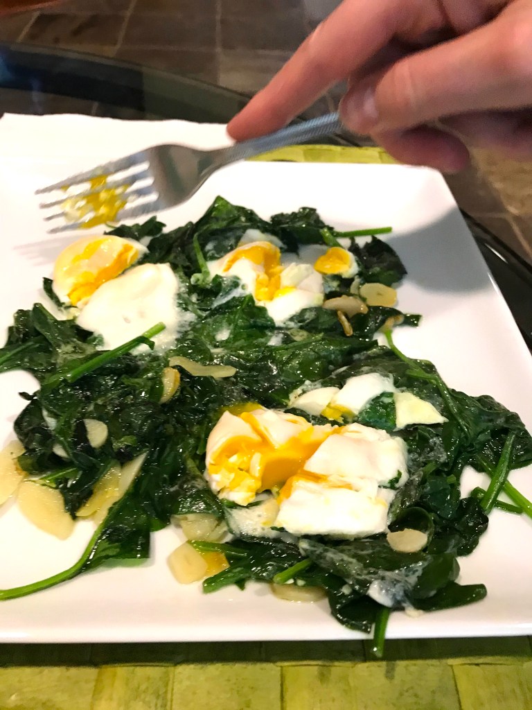 Then, time to take them off the stove and put two eggs, which are nicely poached on top of the wilted spinach and caramelized garlic, on a plate and serve with crusty bread!
