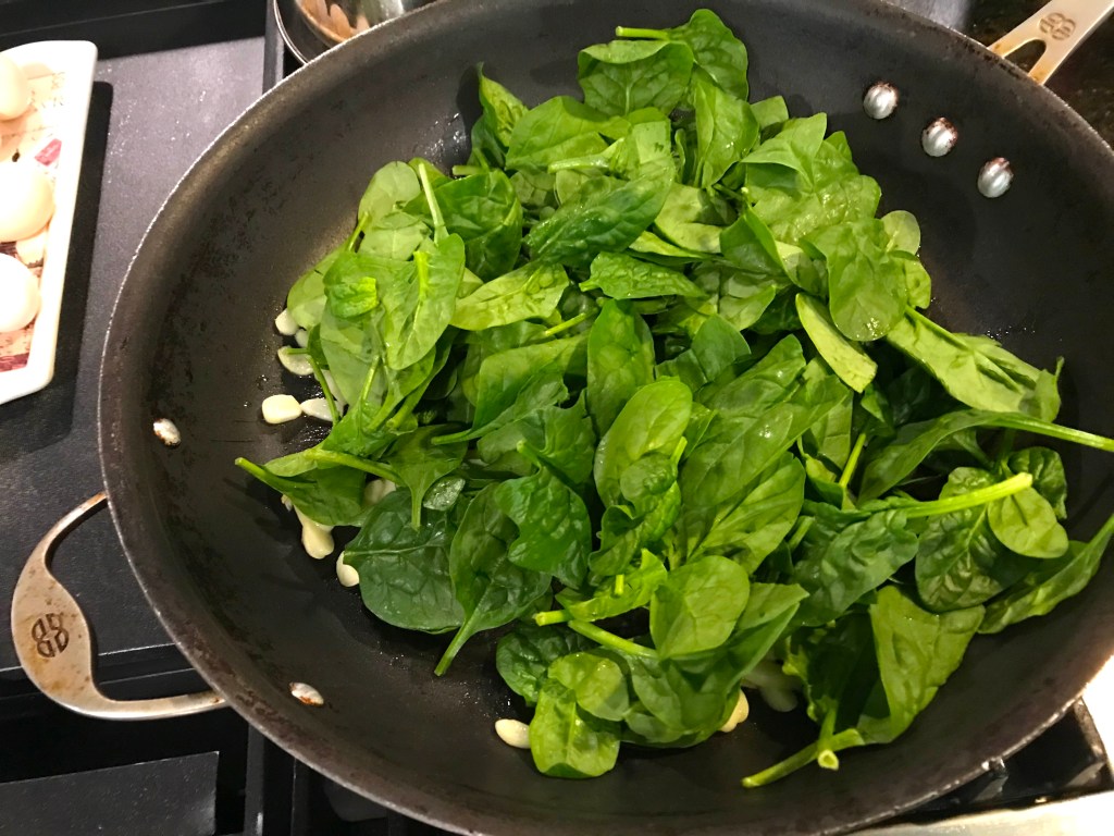 Once cooked, fill the pan with your fresh spinach…