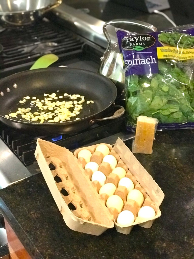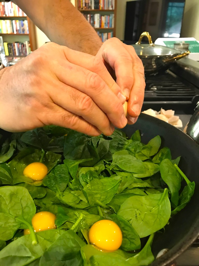 You do NOT need to cook the spinach yet – that is up next! After putting the spinach in the pan, you add the eggs like this: