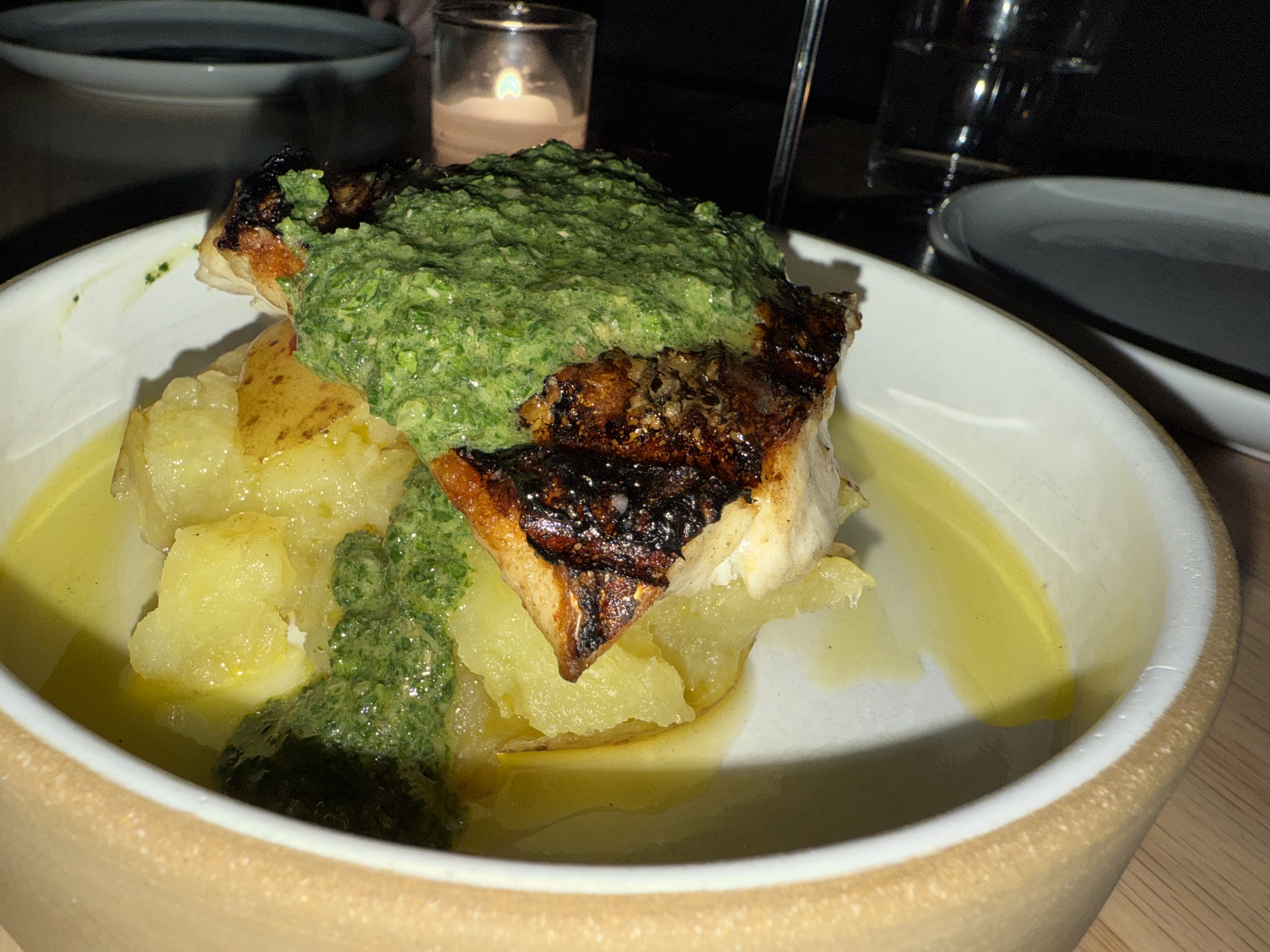 Black Bass, Salsa Verde, Coal Roasted Yukon Gold Potatoes