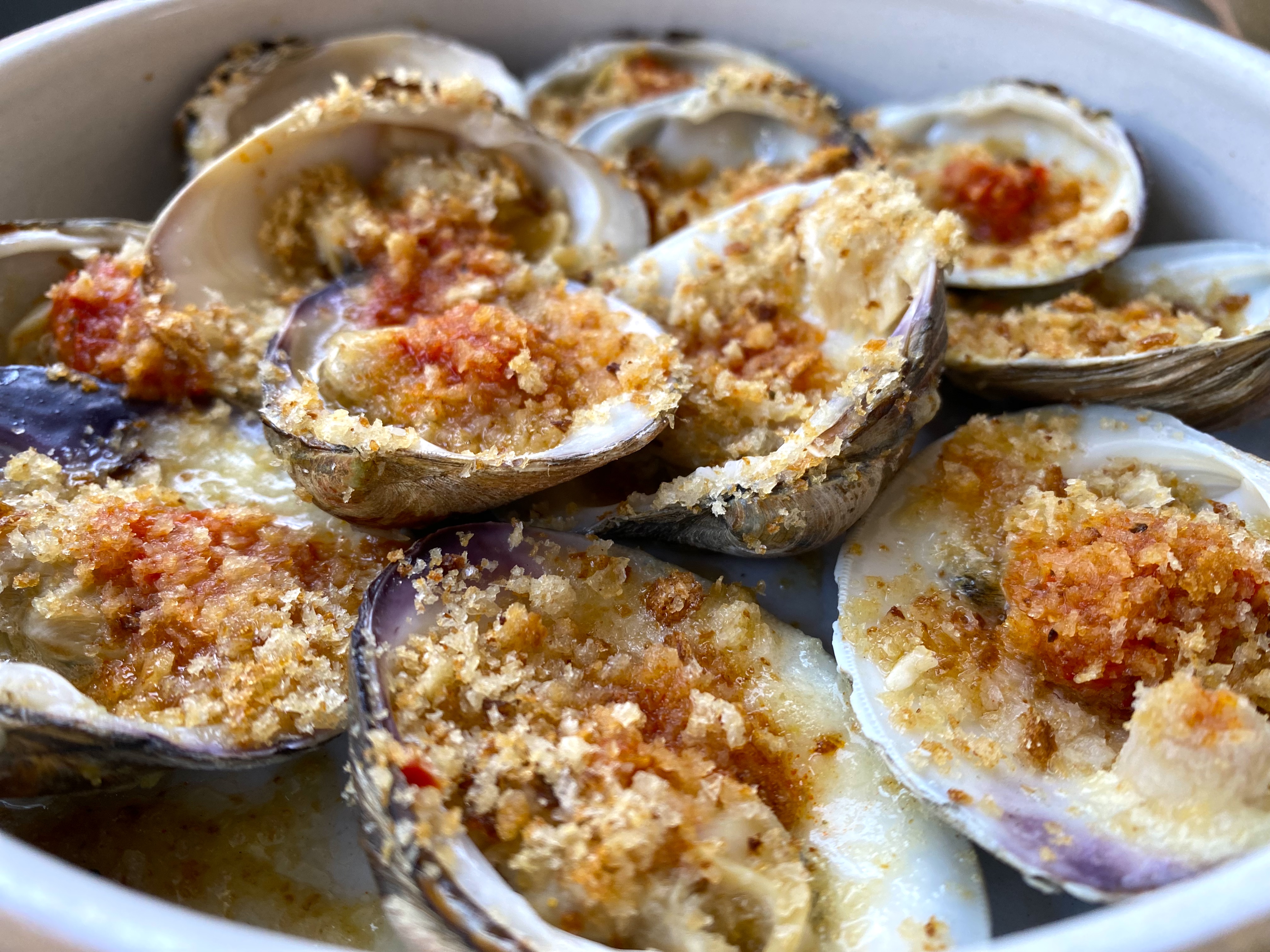 Grilled Clams, Calabrian Chili, Breadcrumbs