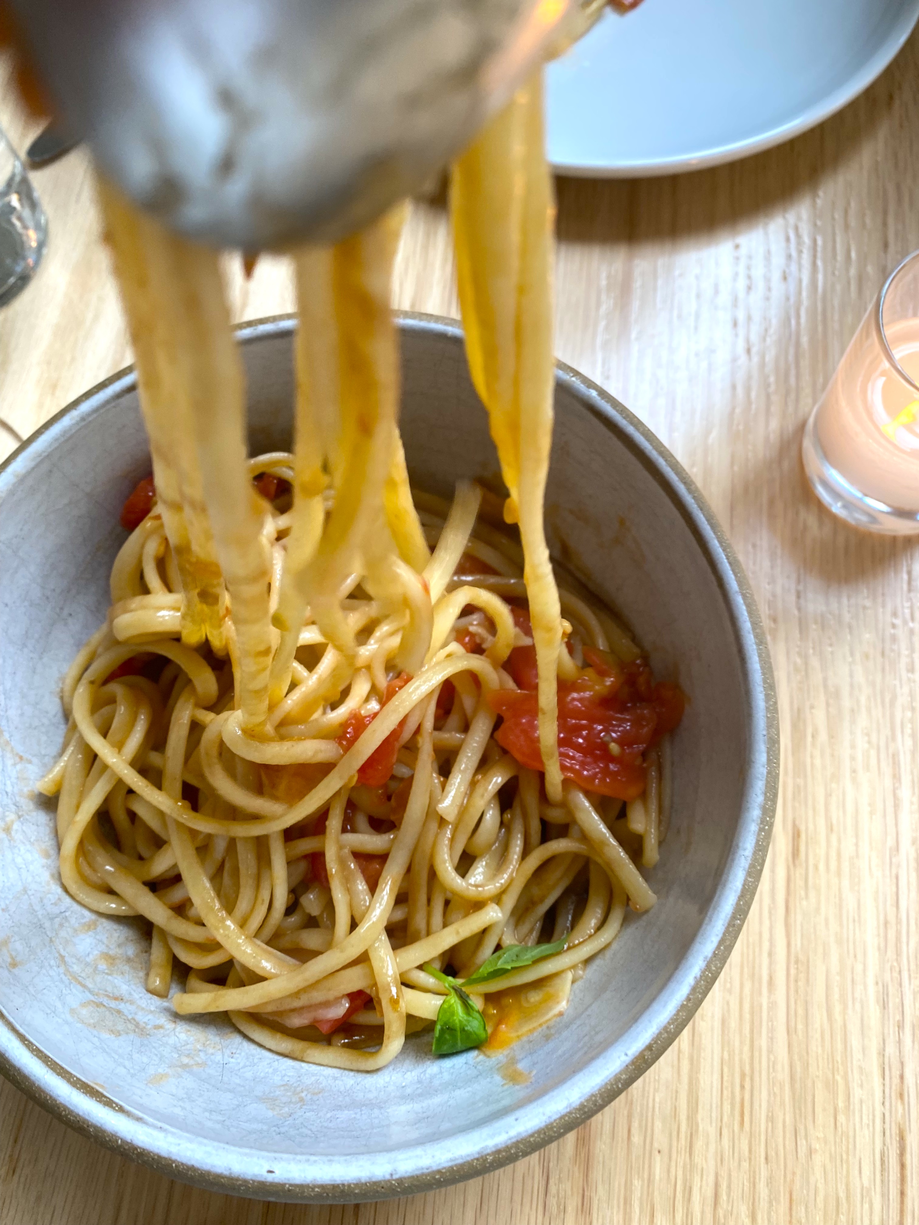 Spaghetti with a with red sauce, fresh tomato and basil – and it allowed me to get my favorite shot of noodles:
