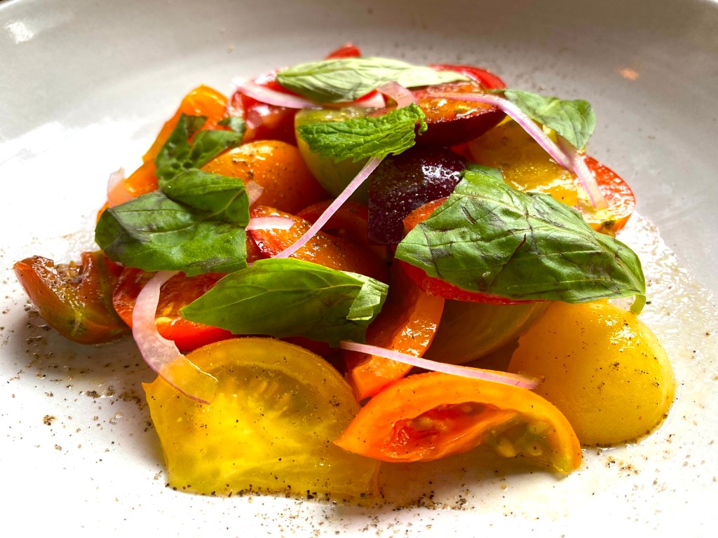 One night we had a special side dish of glazed peas pods…and another night this fresh tomato salad with olive oil and mint leaves was refreshing as well: