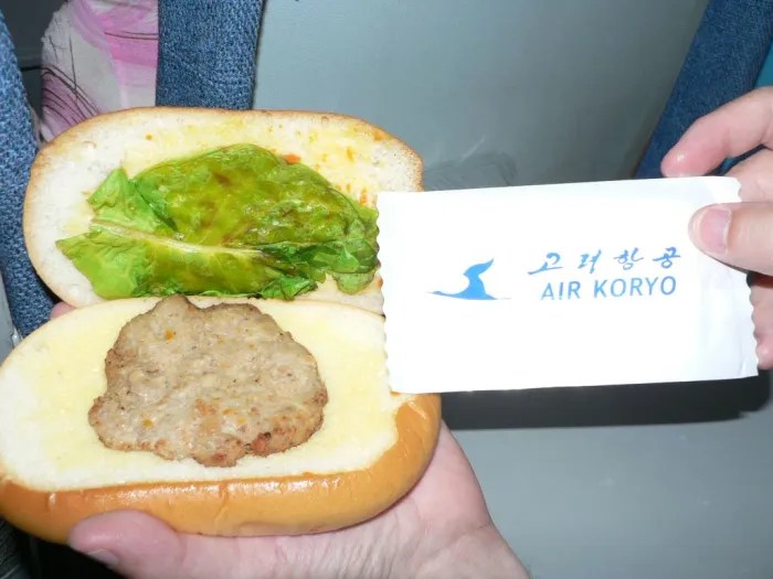 It’s the only thing that Air Koryo, official airline of North Korea, serves to their customers…a “mystery burger” of monumentally bad proportions!