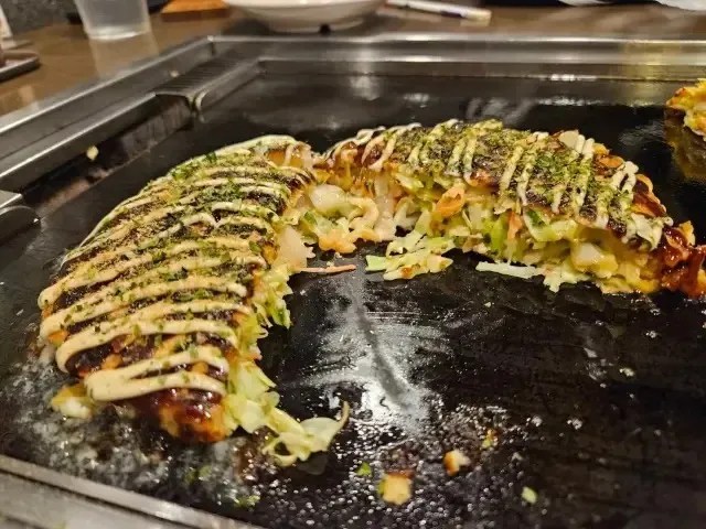 Okonomiyaki, meaning “grilled as you like it,” is a savory Japanese pancake made with flour, eggs, and shredded cabbage, often containing meat, seafood, or other ingredients, and topped with sauce, mayonnaise, and bonito flakes