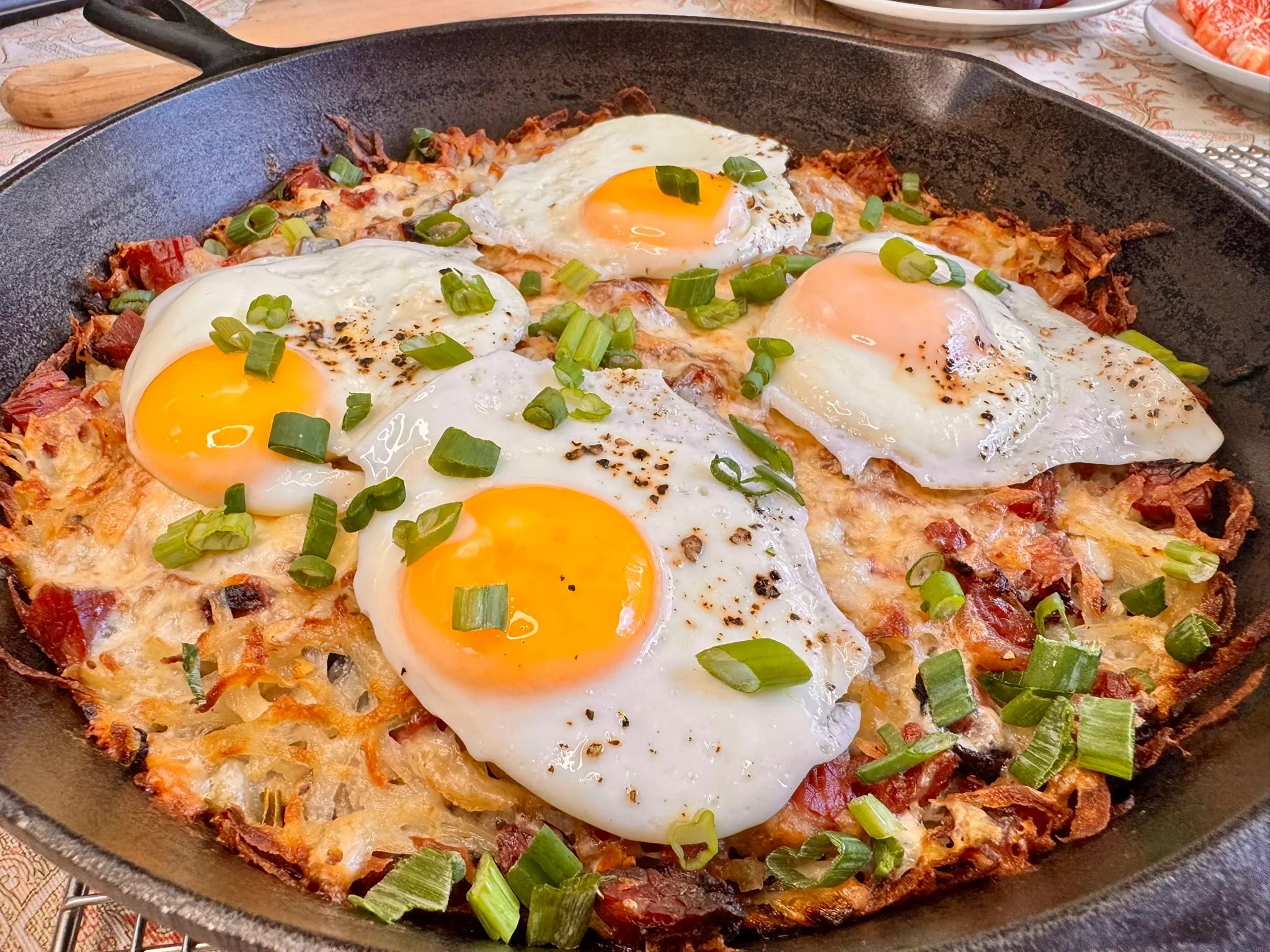 “Growing up, my mom made hash with fresh beef from the local butcher – never canned – and I’ve taken her crispy method, added my own cheesy spin, and borrowed a tip from Snoop’s Goon with the Spoon. He bakes eggs in wells, shakshuka-style, but I’m all about that sunny-side-up finish. It’s farmhouse roots with a modern twist, and trust me, it’s a game-changer.”