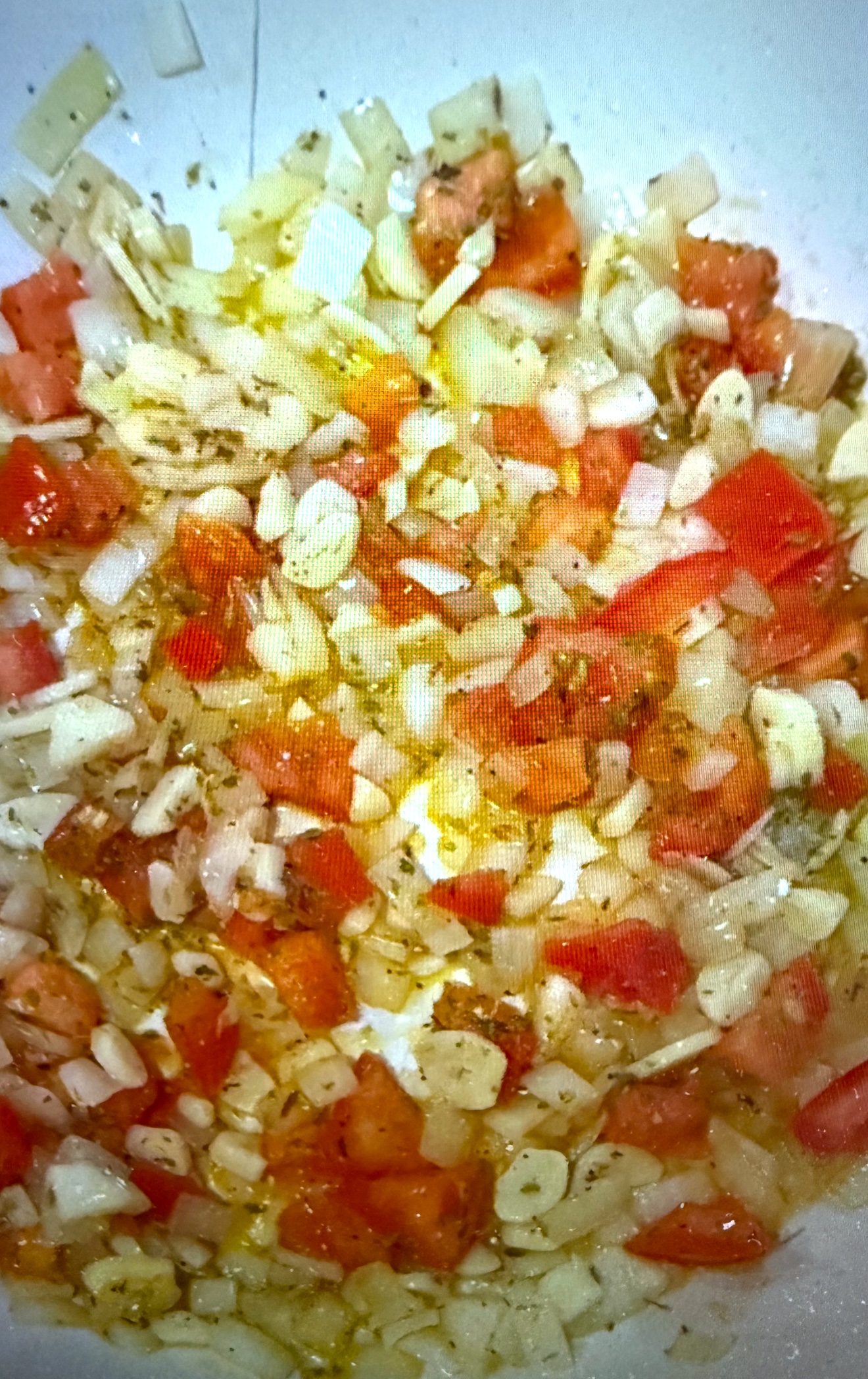 The first step is to cook one diced onion in olive oil, along with the garlic…after five minutes, add the diced tomato and oregano…salt and pepper to taste. Set aside.