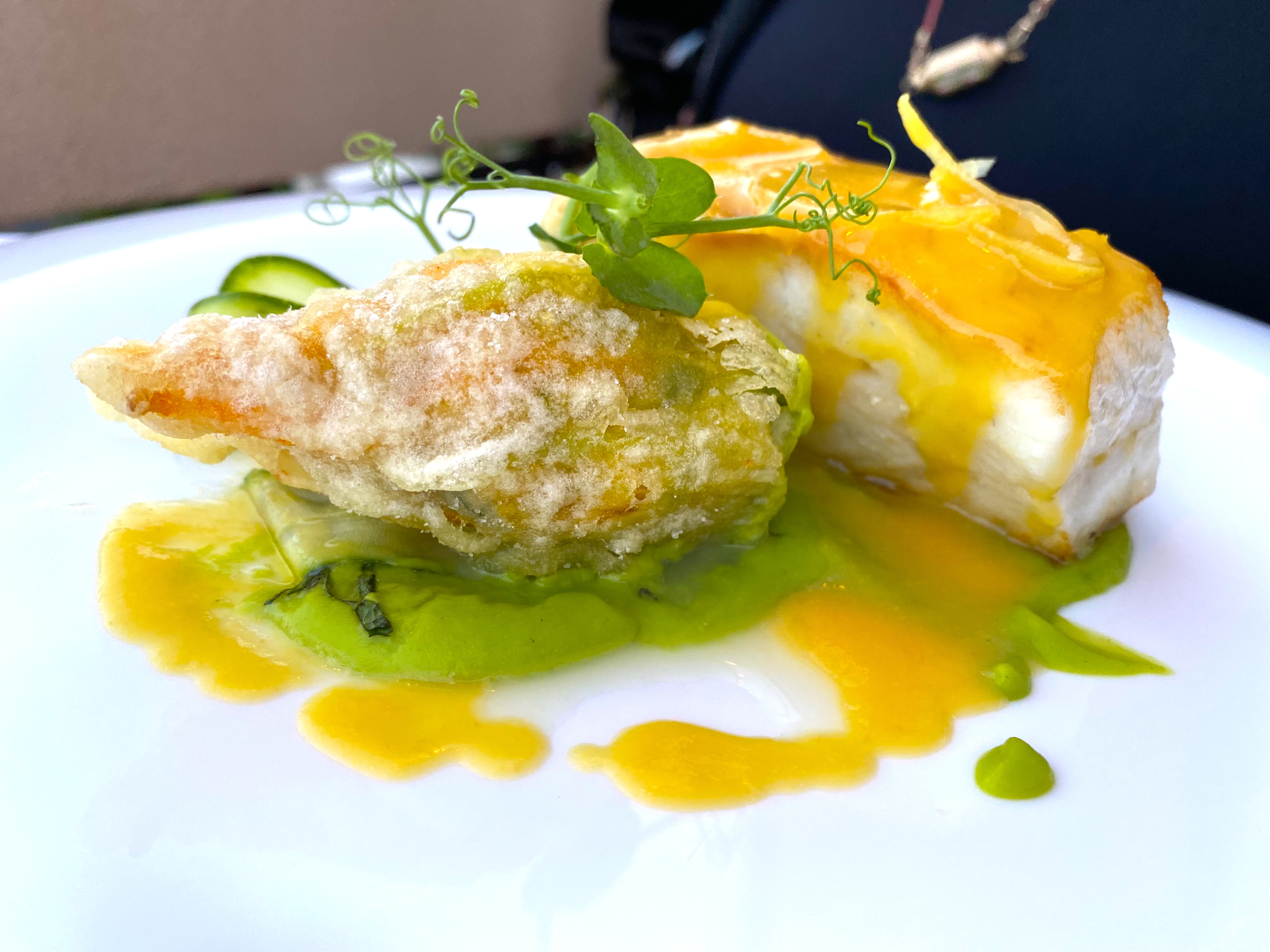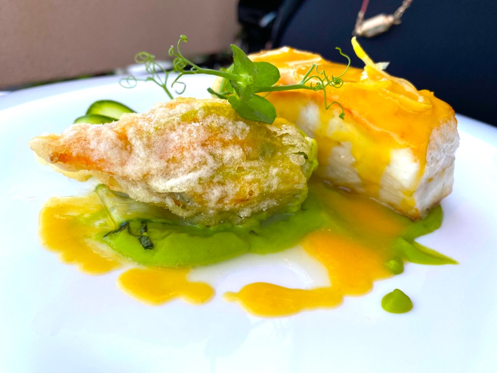 Small bites like this fried Zucchini Blossom along with a delicate white fish led to more seafood: