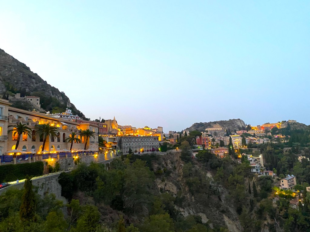 After dark, the views of Taormina are incredible – that’s the town from our hotel room – perched on the edge of this cliff overlook the sea. Here’s more of a tour of the interior of the hotel if you want a full inside look!