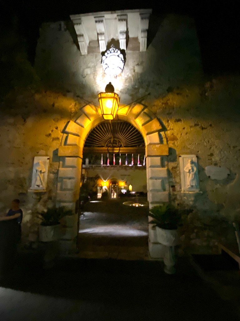 This stunningly beautiful hotel at night is actually the San Domenico Palace – and the entrance is gorgeous: