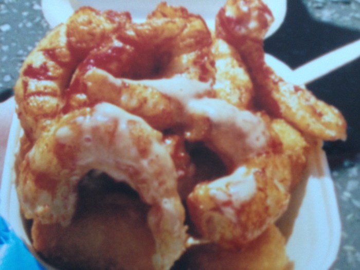 Of course, I just had to have some, and so I ordered a freshly fried container of them – perfectly deep fried SHRIMP AND CRAB CLAWS: