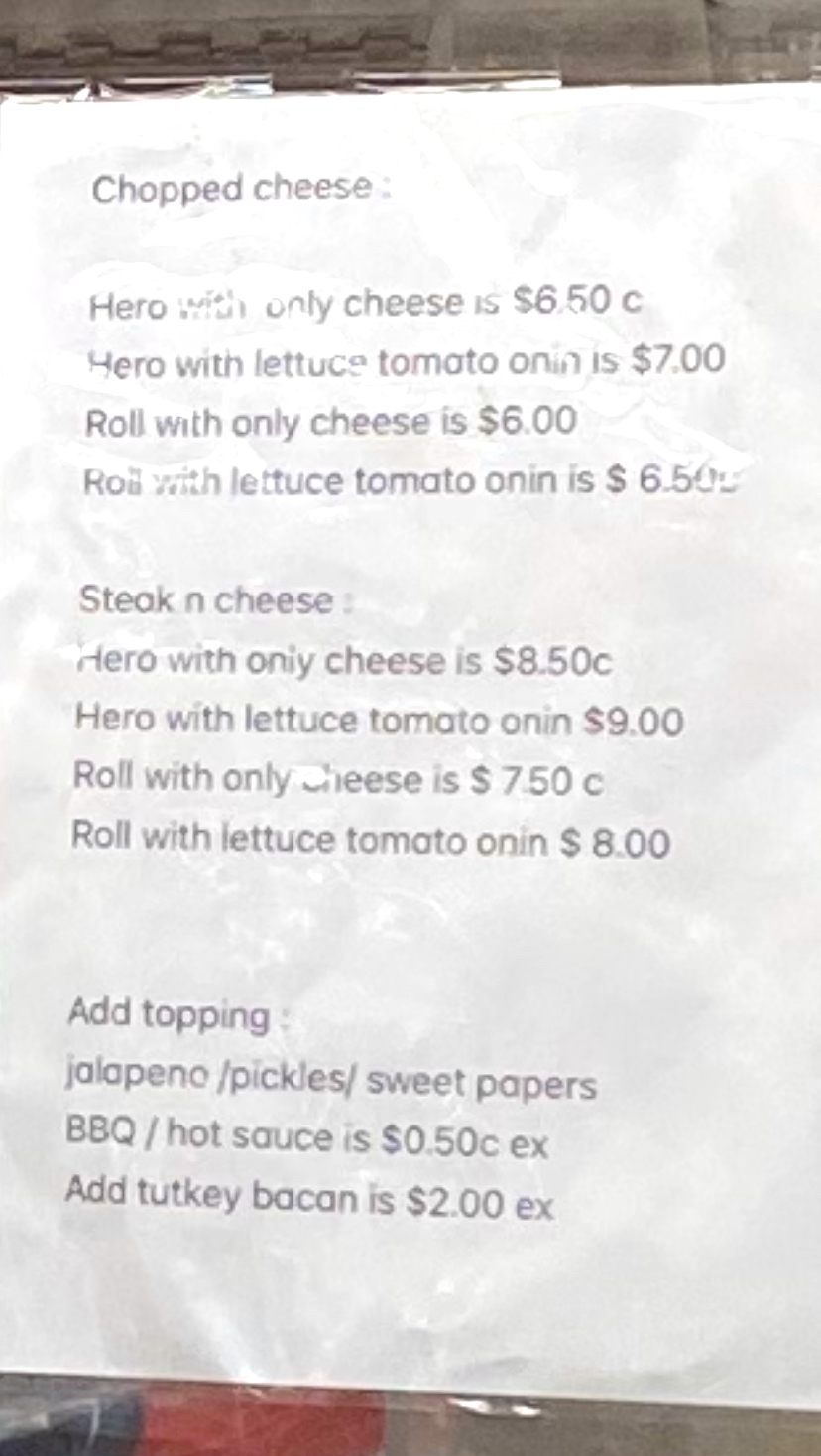 The cook is hidden behind this deli counter, where the menu for sandwiches shows what you can order on your chopped cheese: