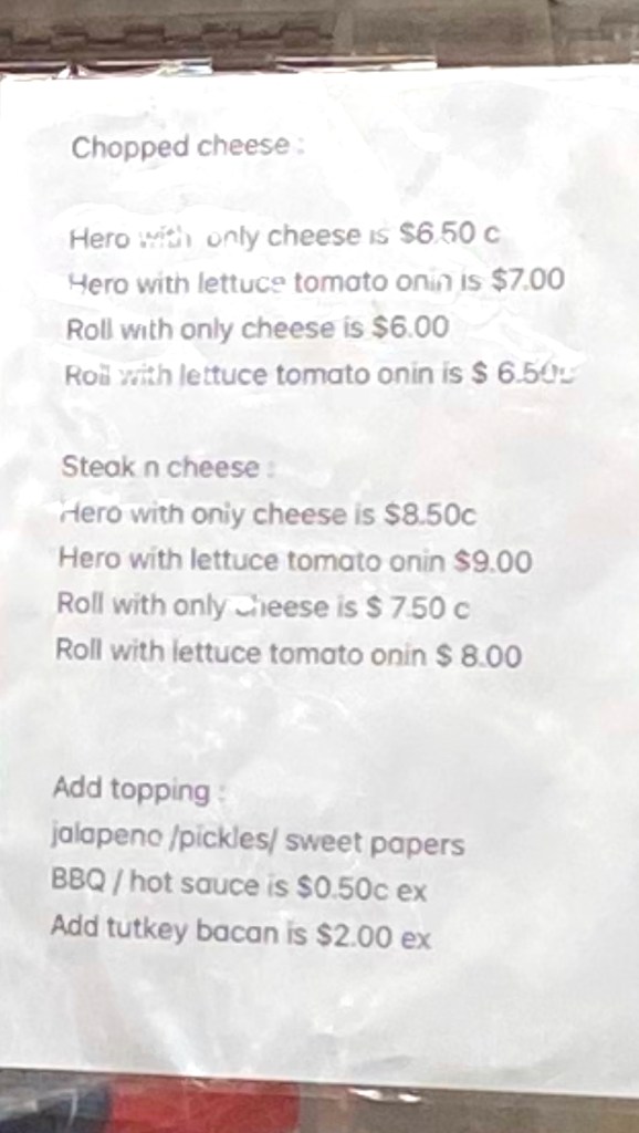 The cashier took the order this way – scrawling letters on a short piece of a cigarette carton…here is what I ordered: a chop cheese “C” on a roll “R” with tomato “T” and onion “O” with pickle “P” but no jalapeno peppers so the “J” is crossed out!