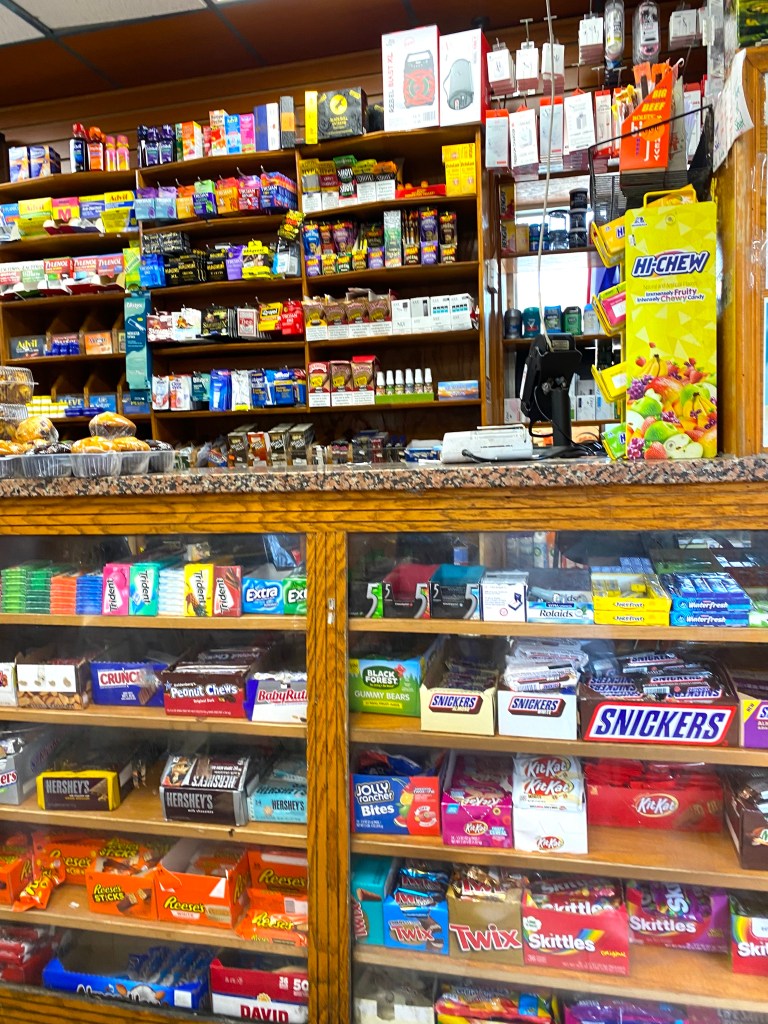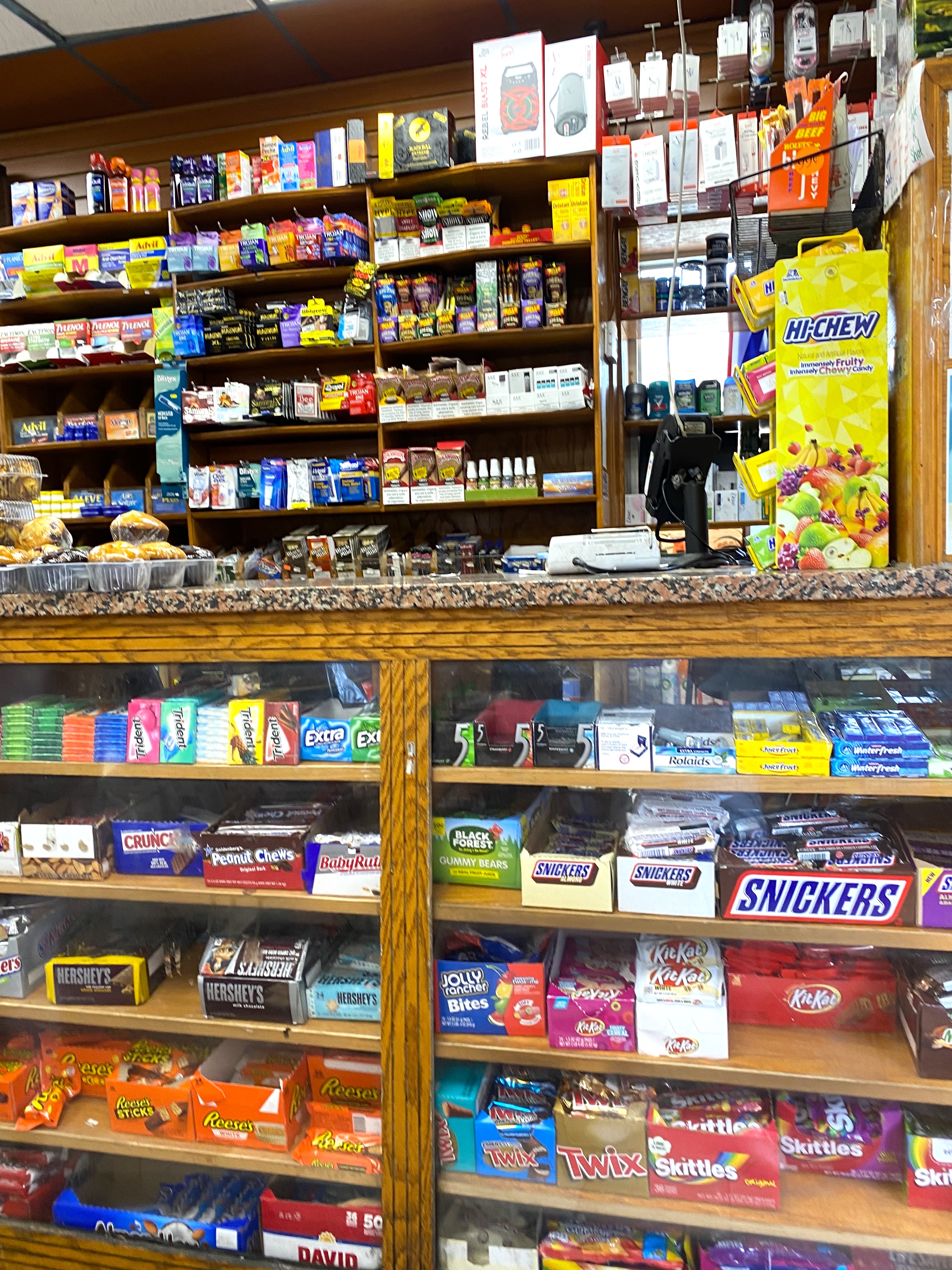 As you can see, lots of candy down low for the kids, and behind the counter there is everything from mini-cigars, cigarettes, condoms and more!