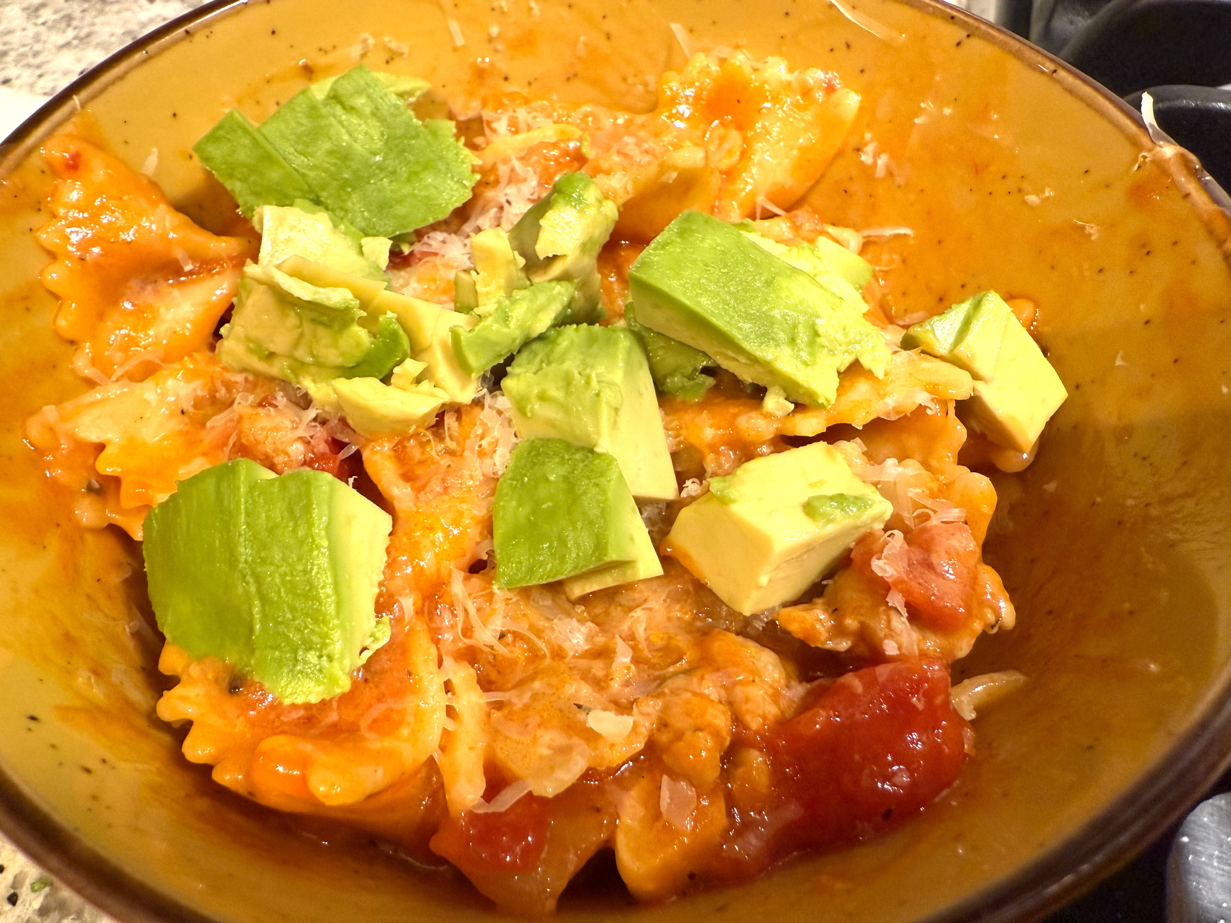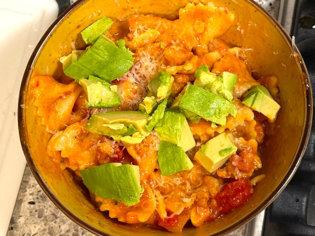 The last touch is to add some diced avocado, and the grated parmesan cheese…I love how quickly it melted into the dish.