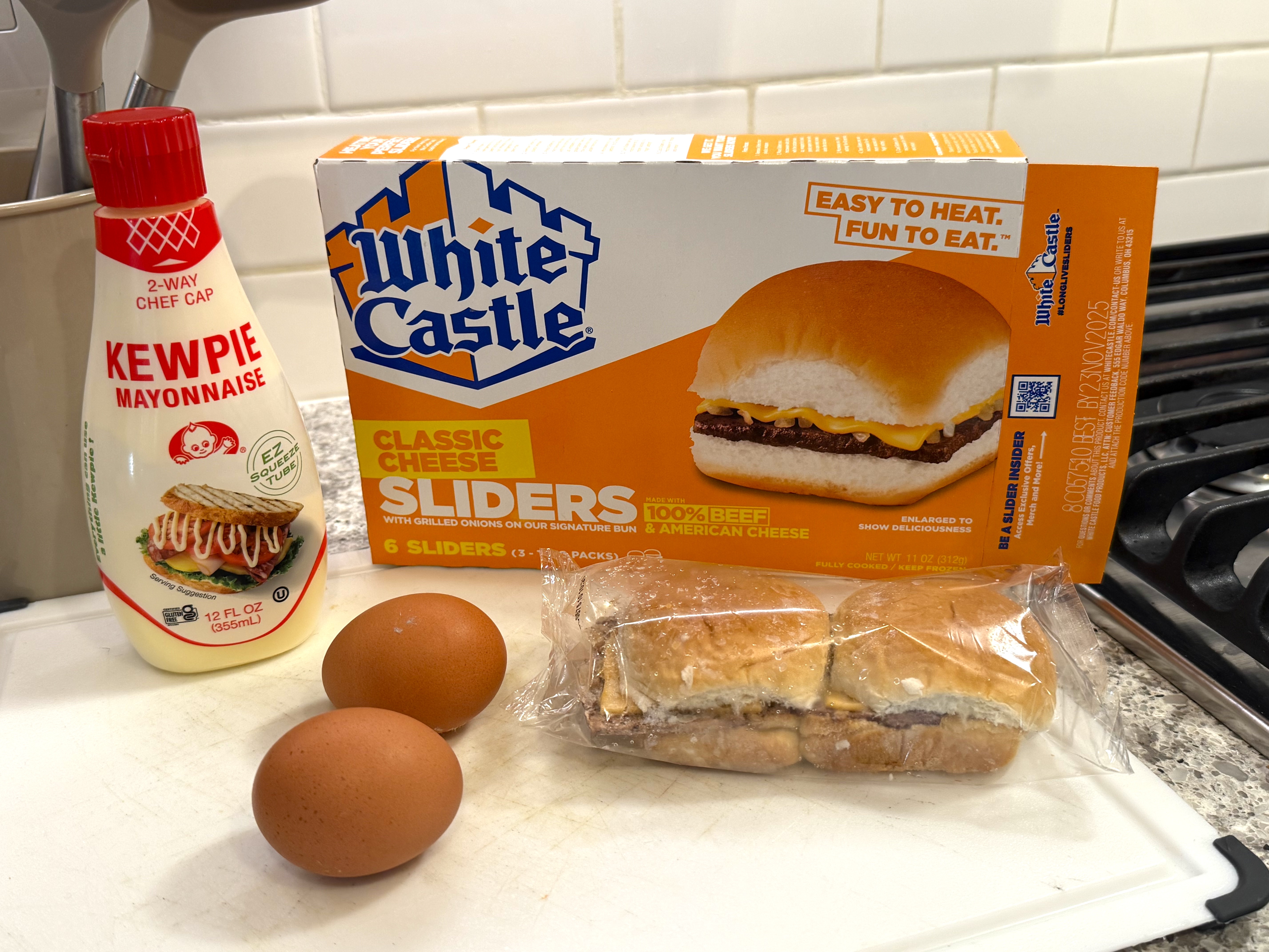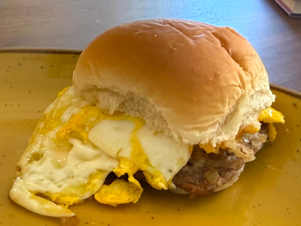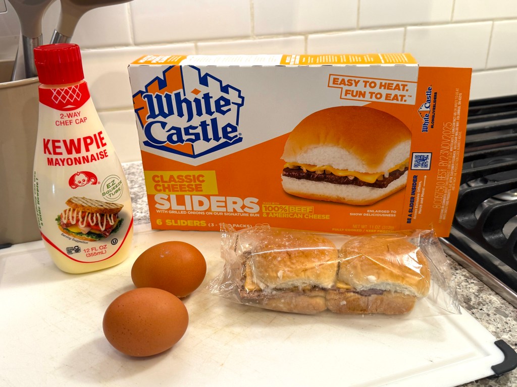 I had some eggs at home and didn’t feel like scrambled eggs for breakfast – and didn’t want a big meal at all – so what to do? Well, using the box of frozen White Castle cheeseburgers I had, I got cooking!