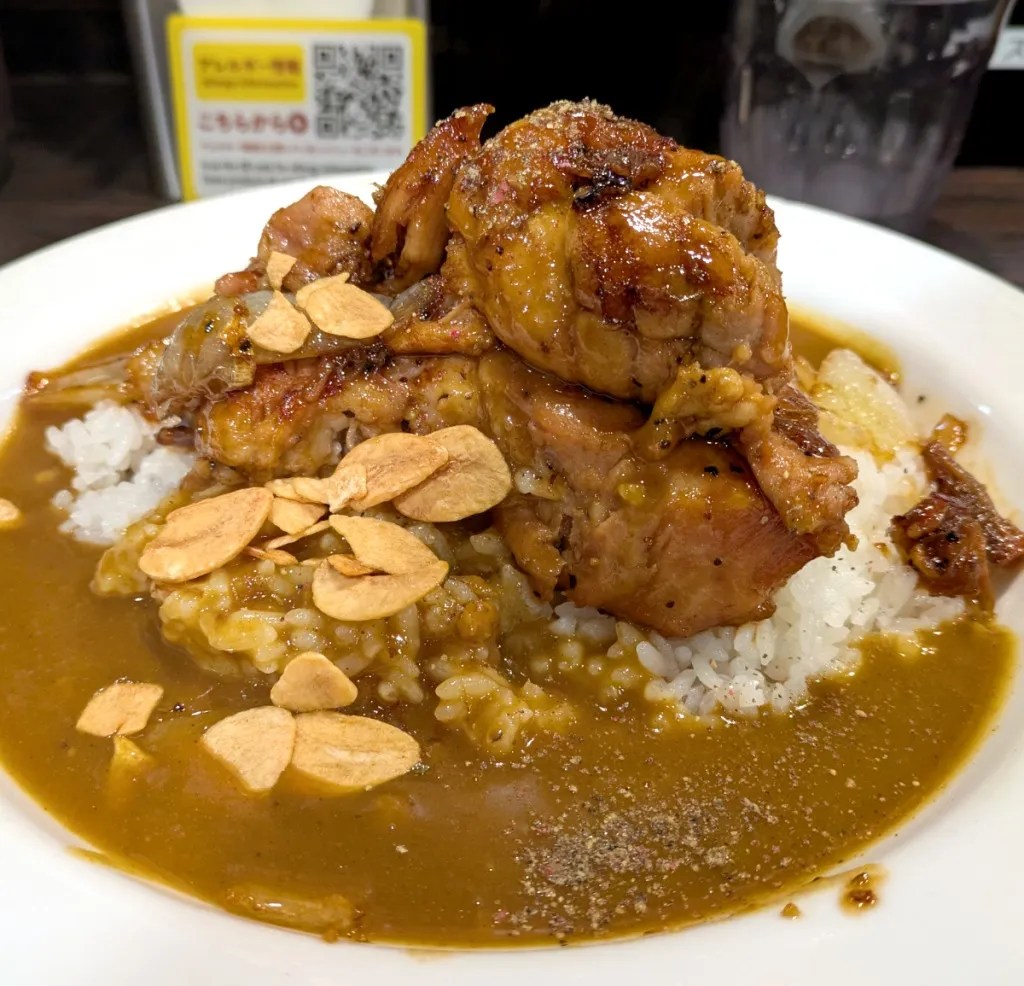 The roux has rich soy sauce notes to it, and is seasoned with four different types of coarse-ground pepper (black, white, green, and pink), plus a sprinkling of fried garlic chips. This is a very aromatic plate of curry rice, and the pepper and garlic shine through stronger than any other flavors in the roux, for a result akin to what’s sometimes called “spice curry” (not to be confused with spicy curry) in Japan.
