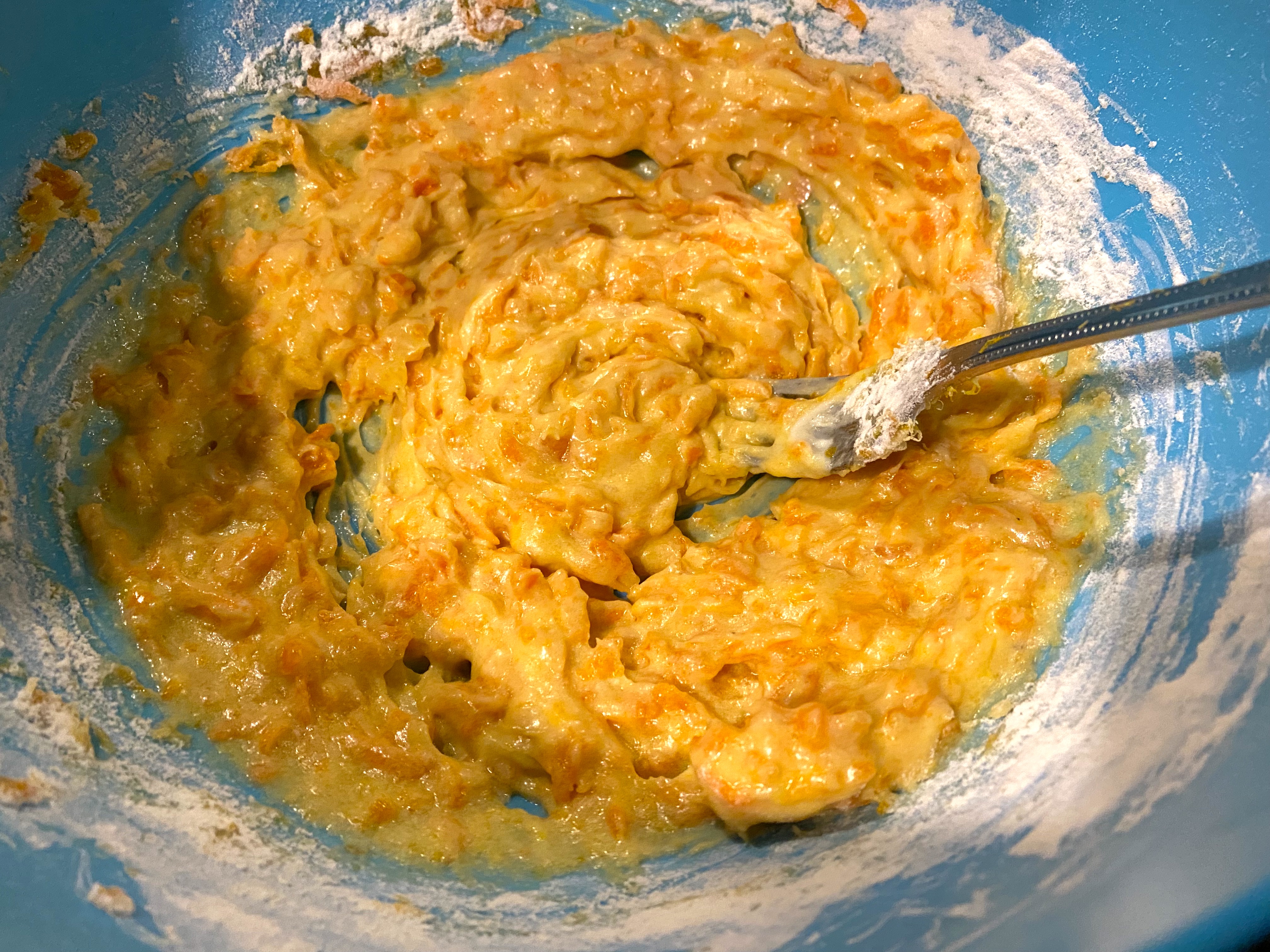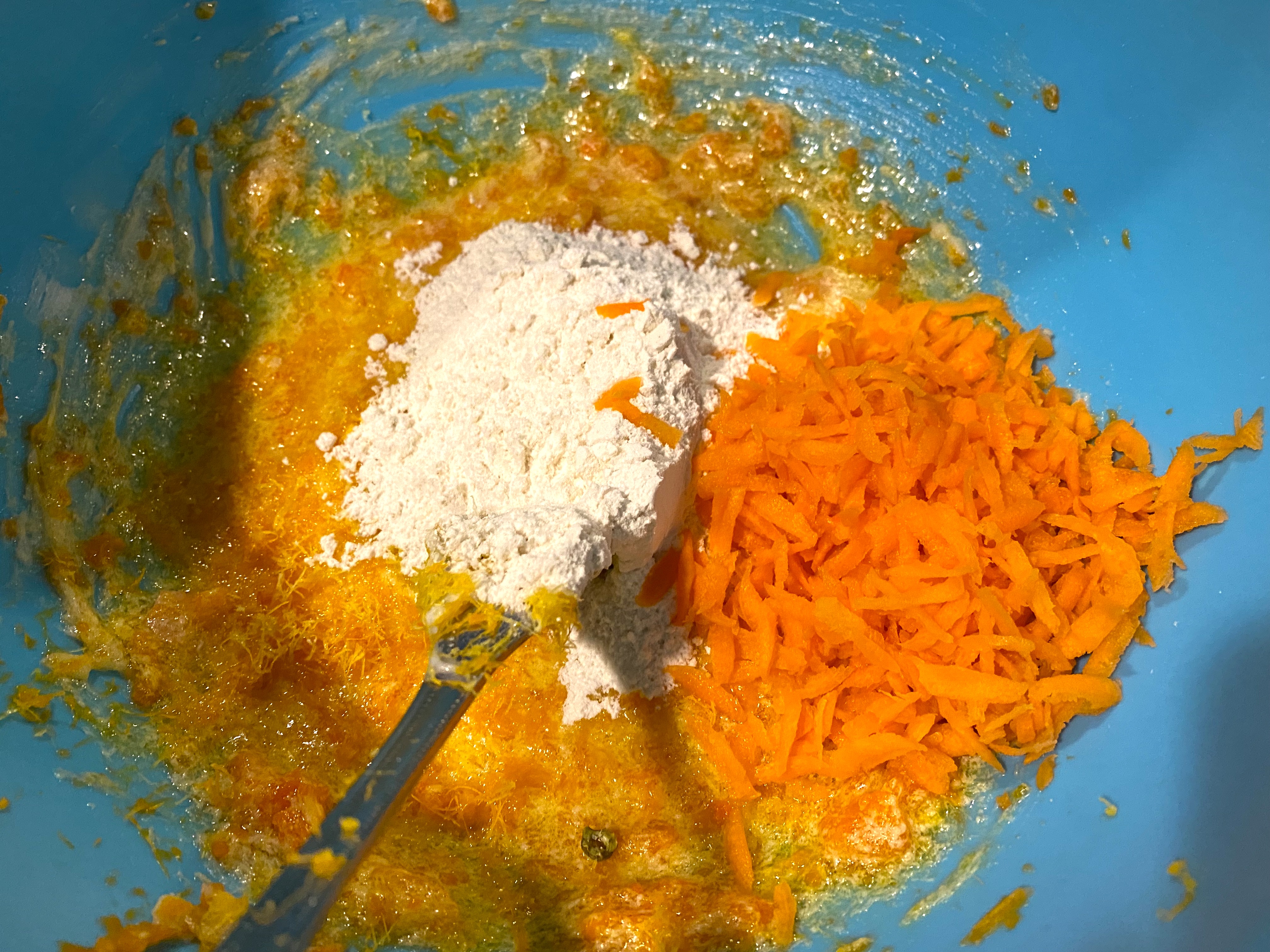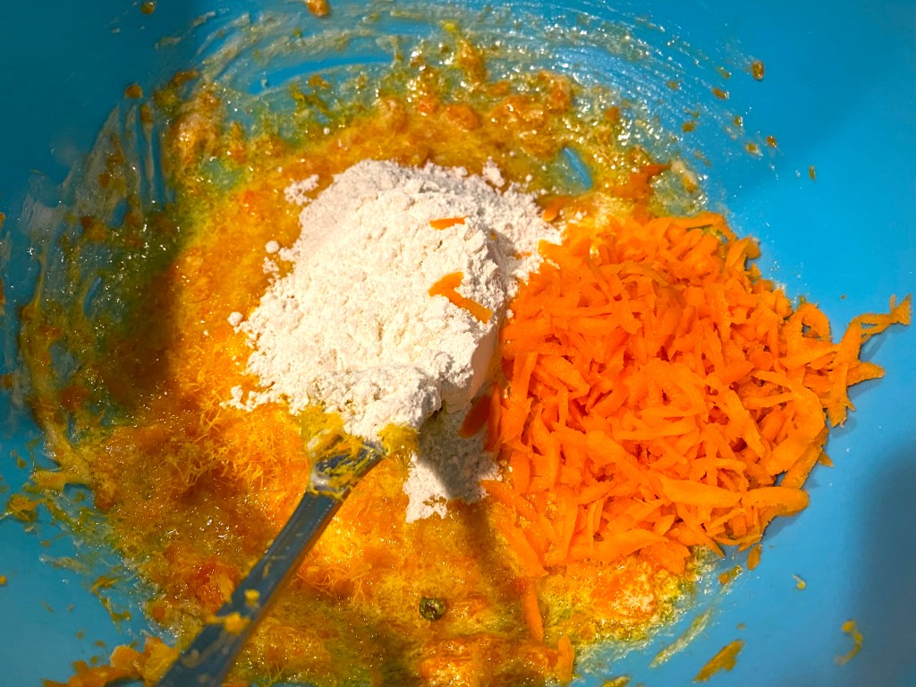 Next, gently fold in the flour, salt and the grated carrots until you have a nice mix…