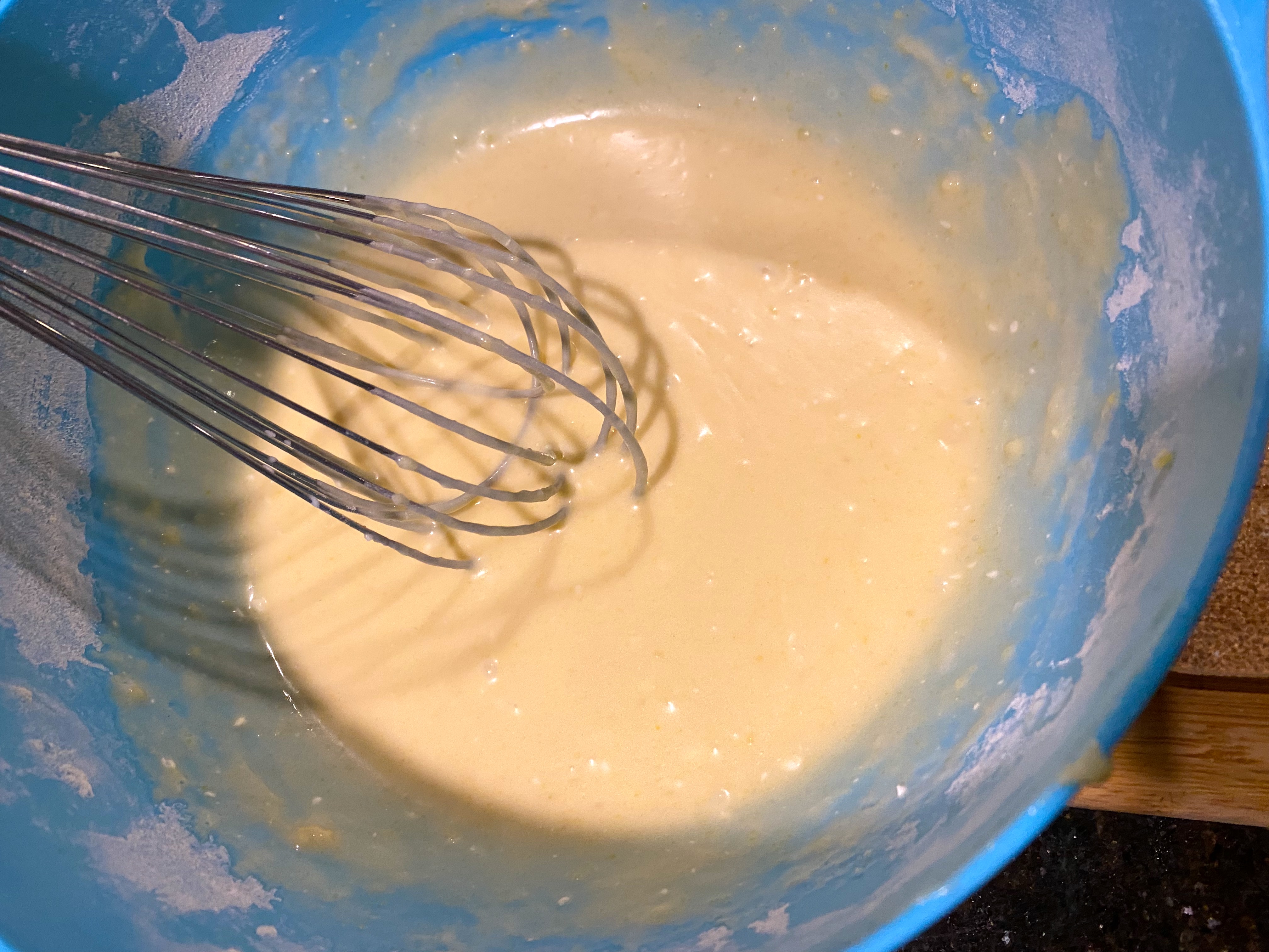Whisk in beaten eggs, then add melted butter, continuing to whisk, it will become a nice creamy batter…