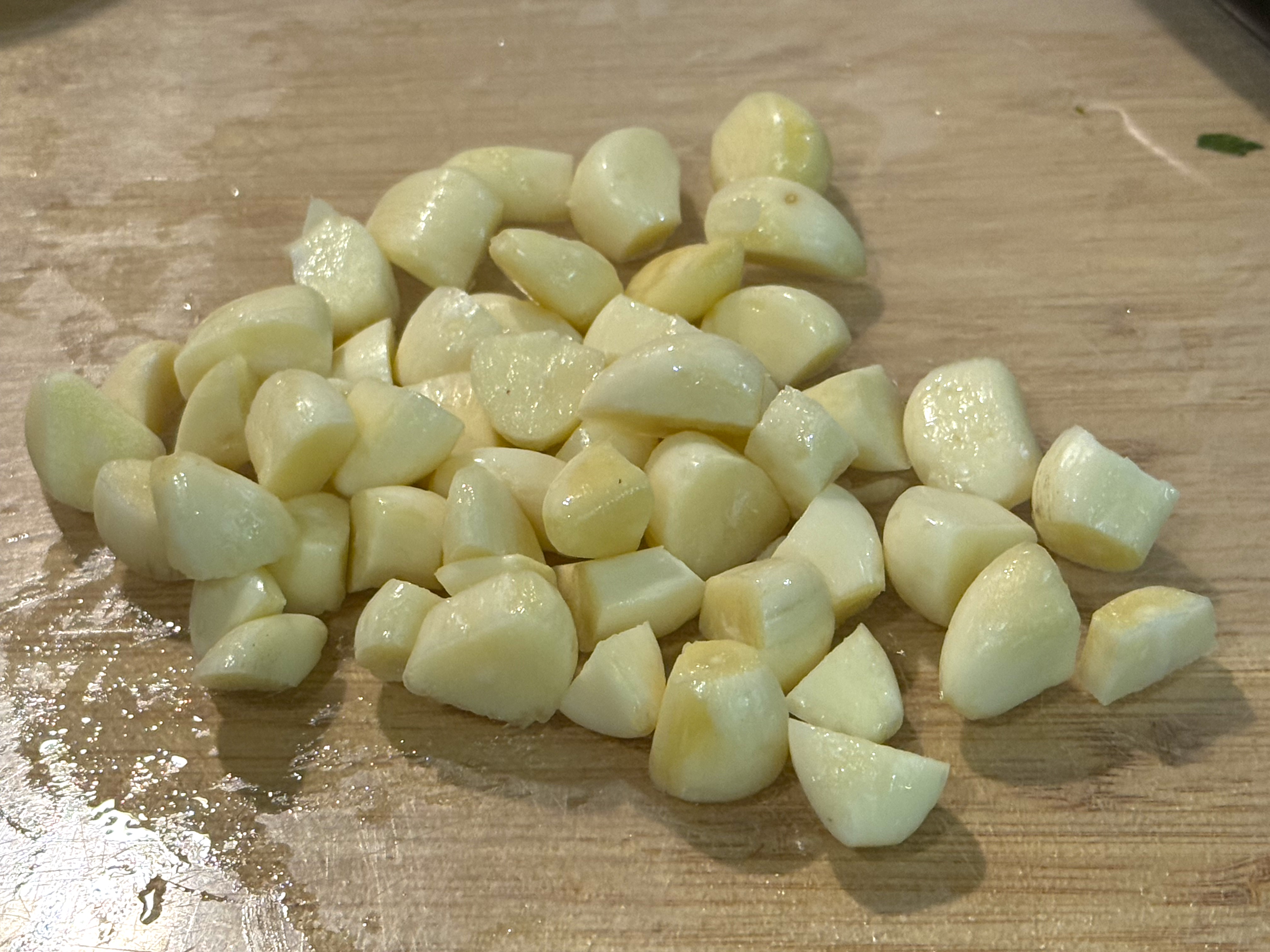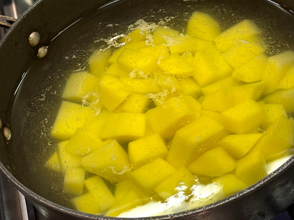 Dice the potatoes and boil them….then, let’s make the garlic butter sauce that goes into them: