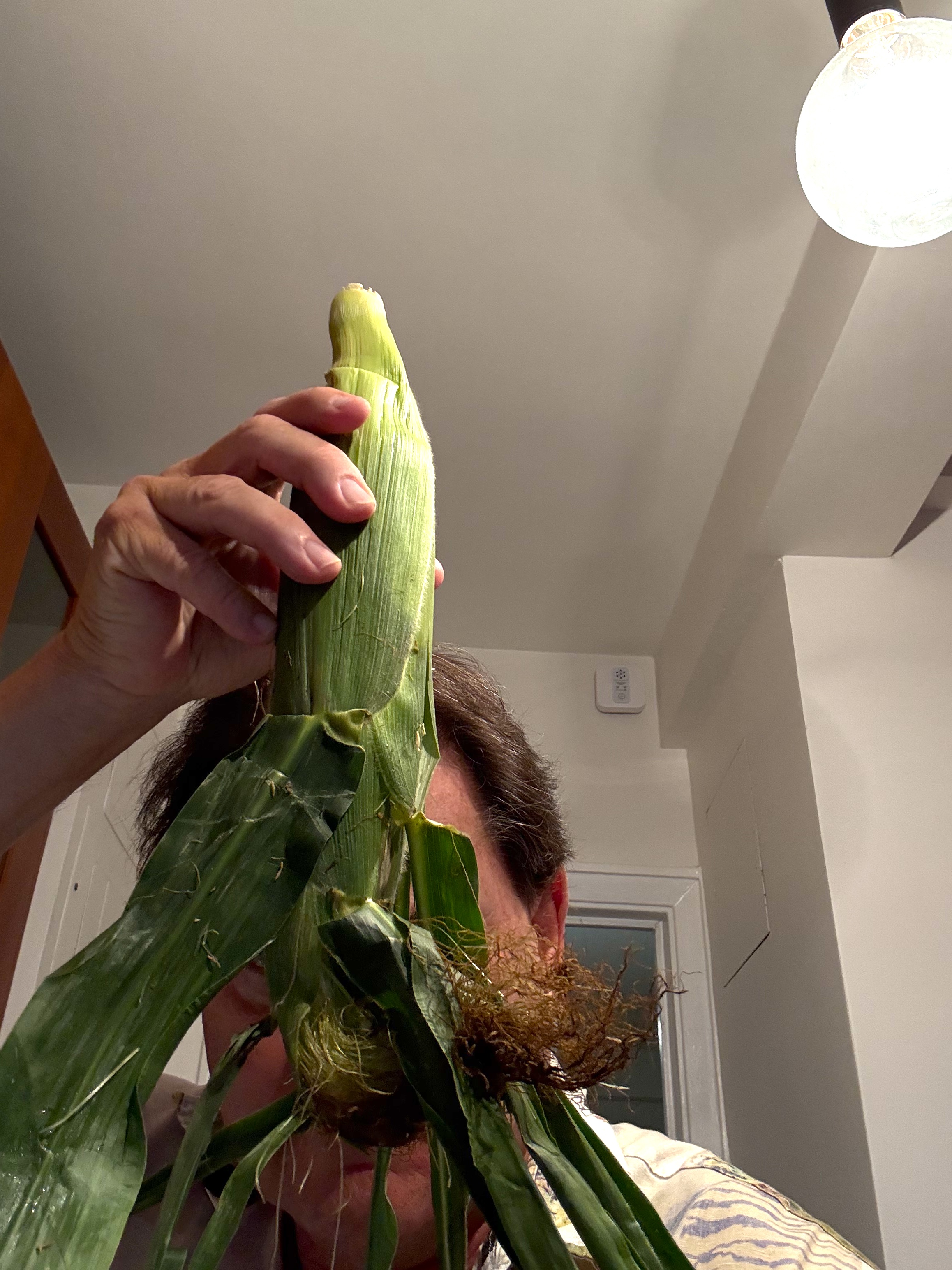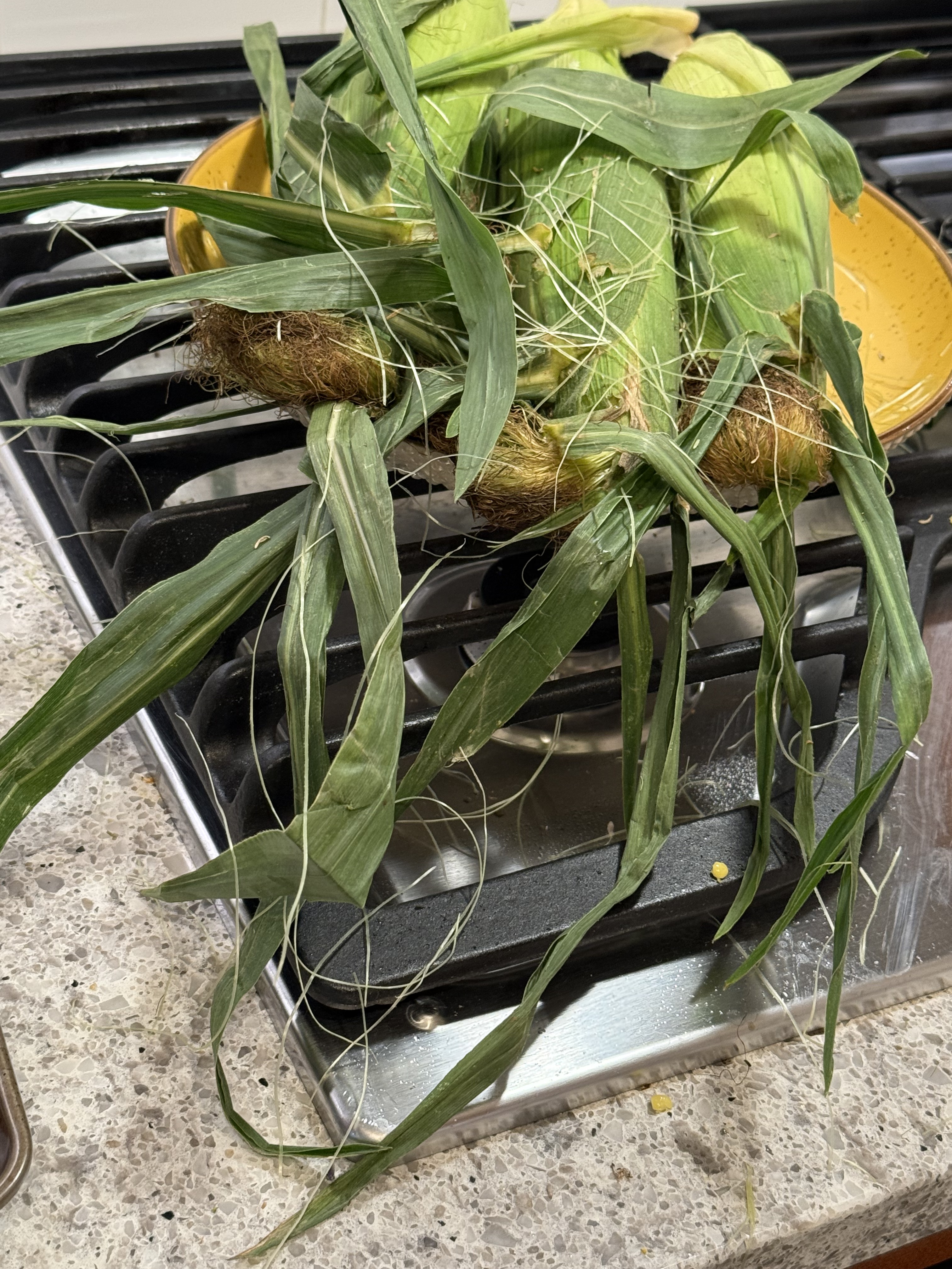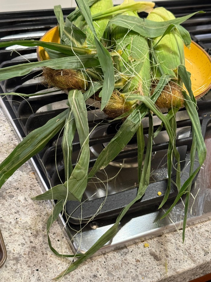 Yes, that’s me with one of the ears of corn I’ll be shucking….and since they were from the Farmers Market, I knew they were fresh!