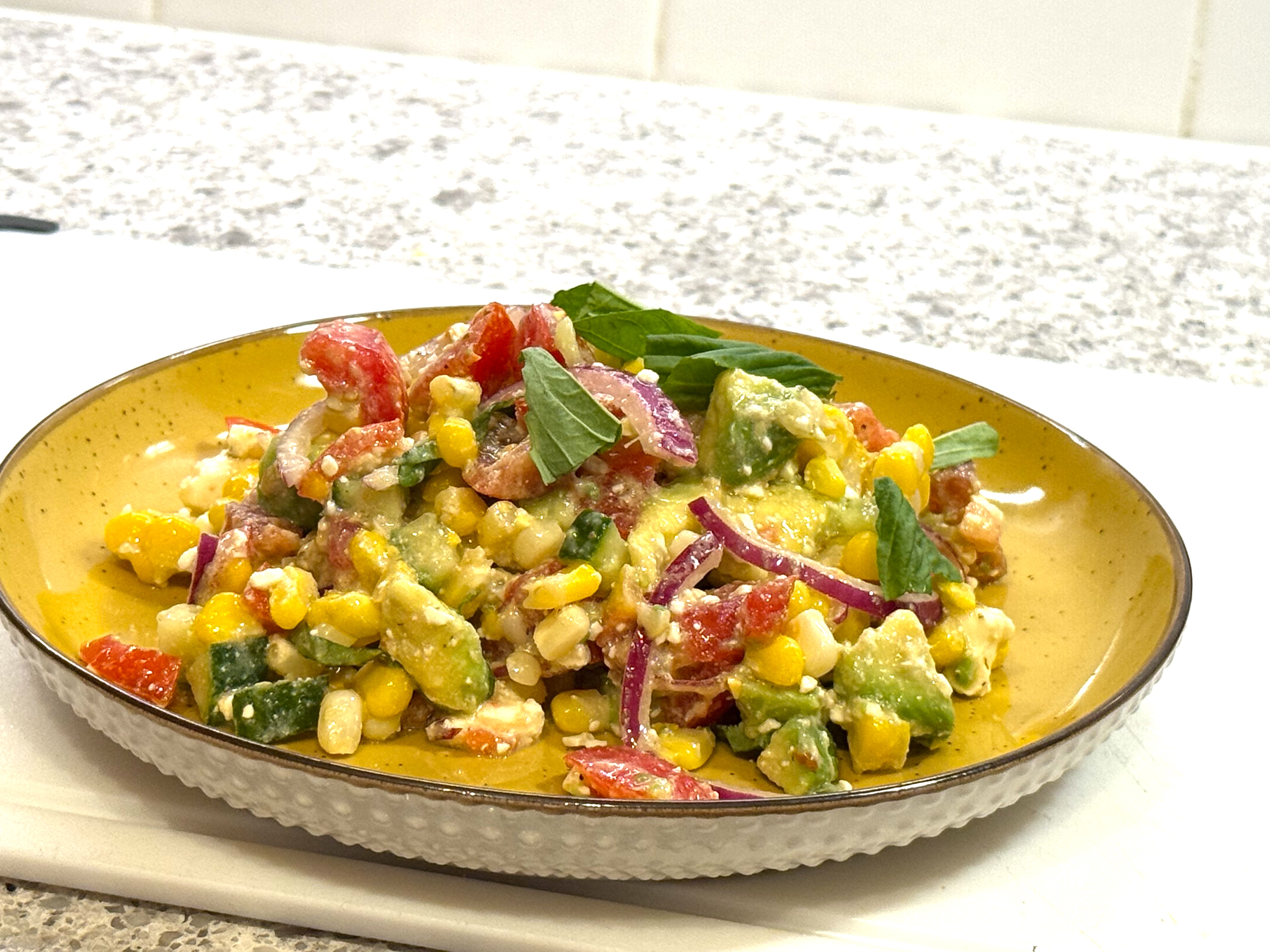 Pour the dressing over the corn then toss to combine. Taste and add more salt and pepper as needed, garnish with some additional basil le
