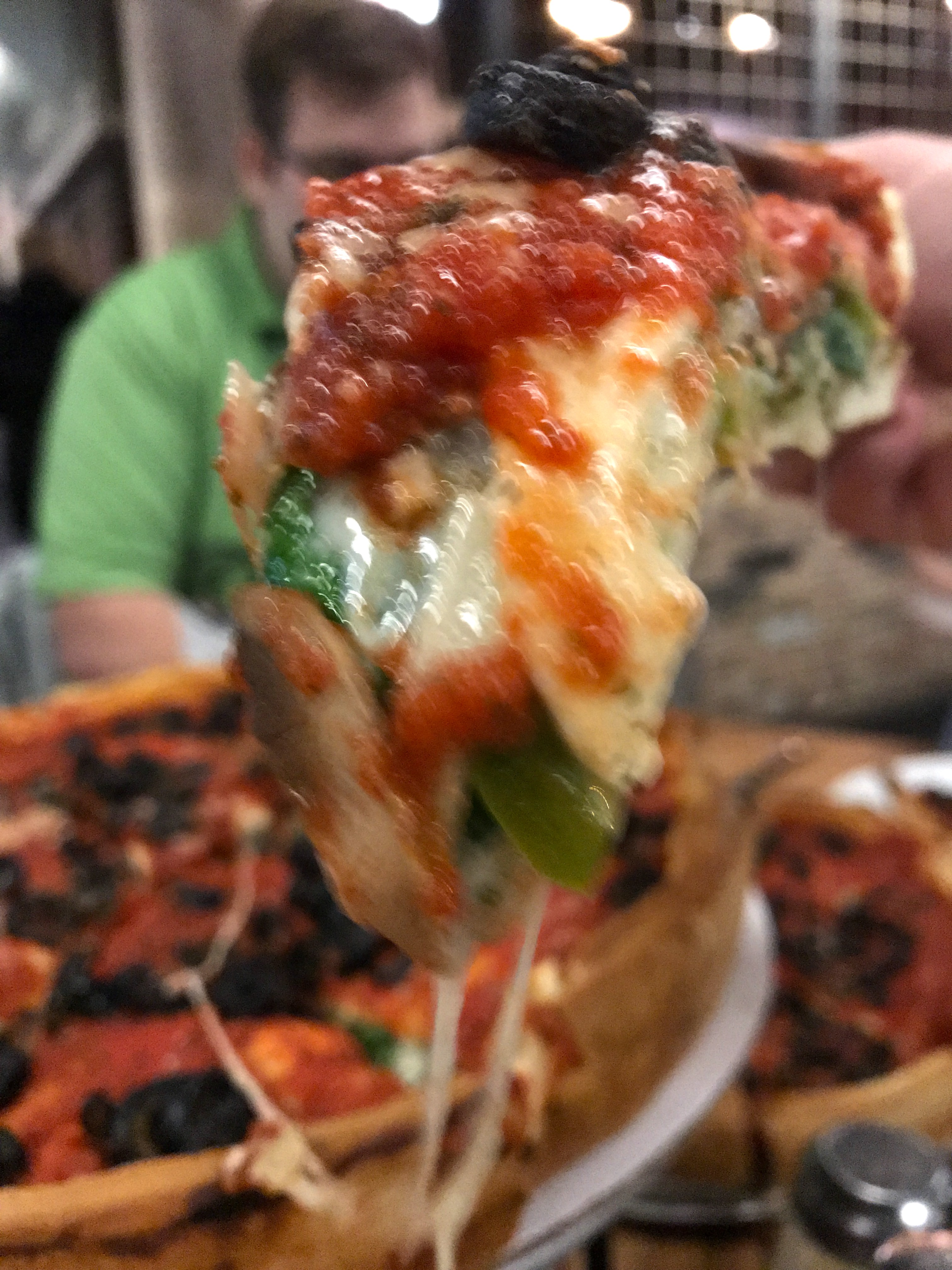 This slice of deep dish heaven is from Lou Malnati’s restaurant – home of the iconic “Deep Dish Pizza” that Chicago is famous for – it’s a thick, hearty, pie-like pizza cooked in a deep, round pan. Unlike conventional pizza, the layers are inverted, with cheese and toppings going on first, and a chunky tomato sauce covering the top.